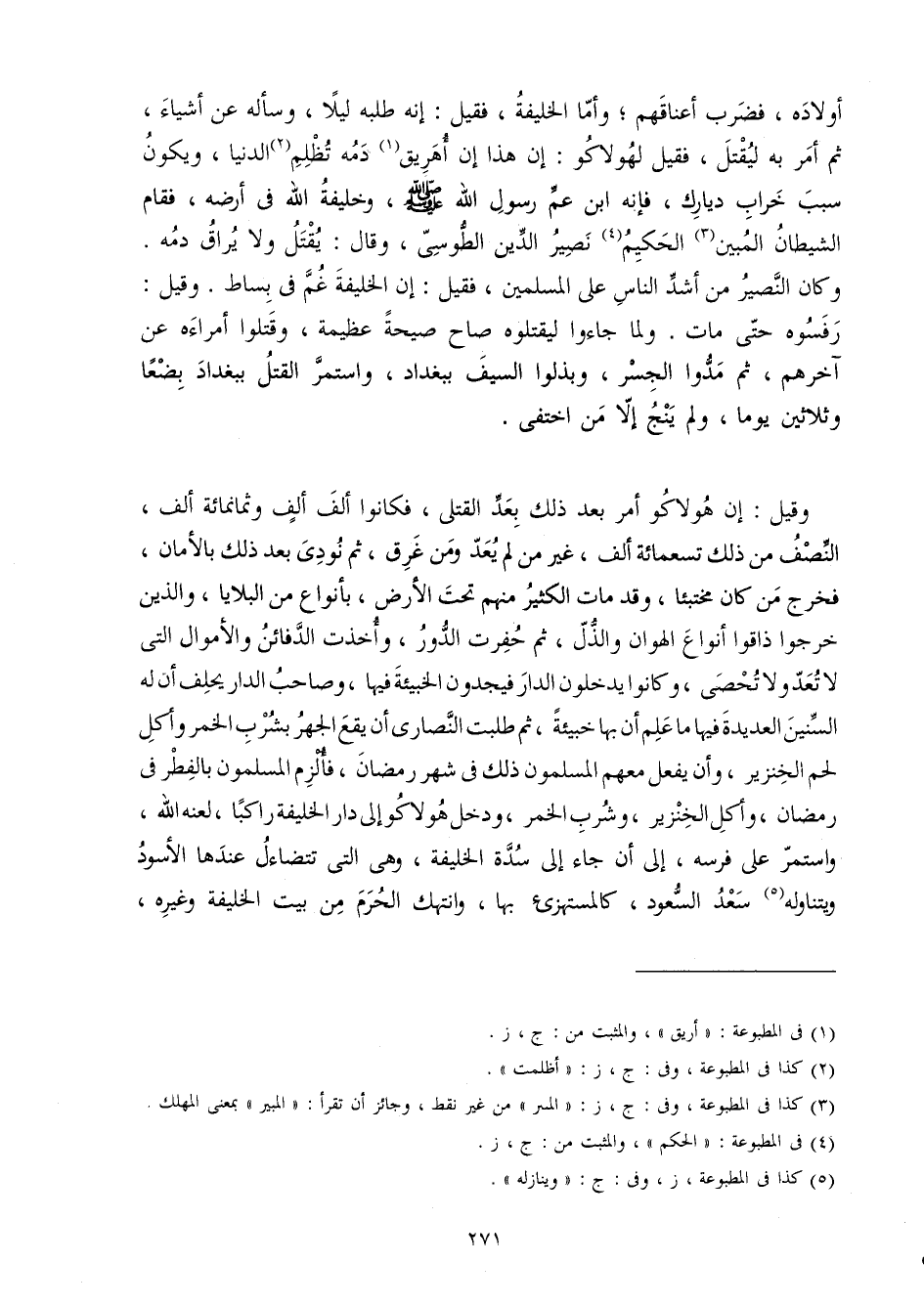 أَوْلَاده فَضرب أَعْنَاقهم وَأما الْخَلِيفَة فَقيل إِنَّه طلبه لَيْلًا وَسَأَلَهُ عَن أَشْيَاء ثمَّ أَمر بِهِ ليقْتل فَقيل لهولاكو إِن هَذَا إِن أهريق دَمه تظلم الدُّنْيَا وَيكون سَبَب خراب دِيَارك فَإِنَّهُ ابْن عَم رَسُول الله صلى الله عَلَيْهِ وَسلم وَخَلِيفَة الله فِي أرضه فَقَامَ الشَّيْطَان الْمُبين الْحَكِيم نصير الدّين الطوسي وَقَالَ يقتل وَلَا يراق دَمه وَكَانَ النصير من أَشد النَّاس على الْمُسلمين فَقيل إِن الْخَلِيفَة غم فِي بِسَاط وَقيل رفسوه حَتَّى مَاتَ وَلما جَاءُوا ليقتلوه صَاح صَيْحَة عَظِيمَة وَقتلُوا أمراءه عَن آخِرهم ثمَّ مدوا الجسر وبذلوا السَّيْف بِبَغْدَاد وَاسْتمرّ الْقَتْل بِبَغْدَاد بضعا وَثَلَاثِينَ يَوْمًا وَلم ينج إِلَّا من اختفى