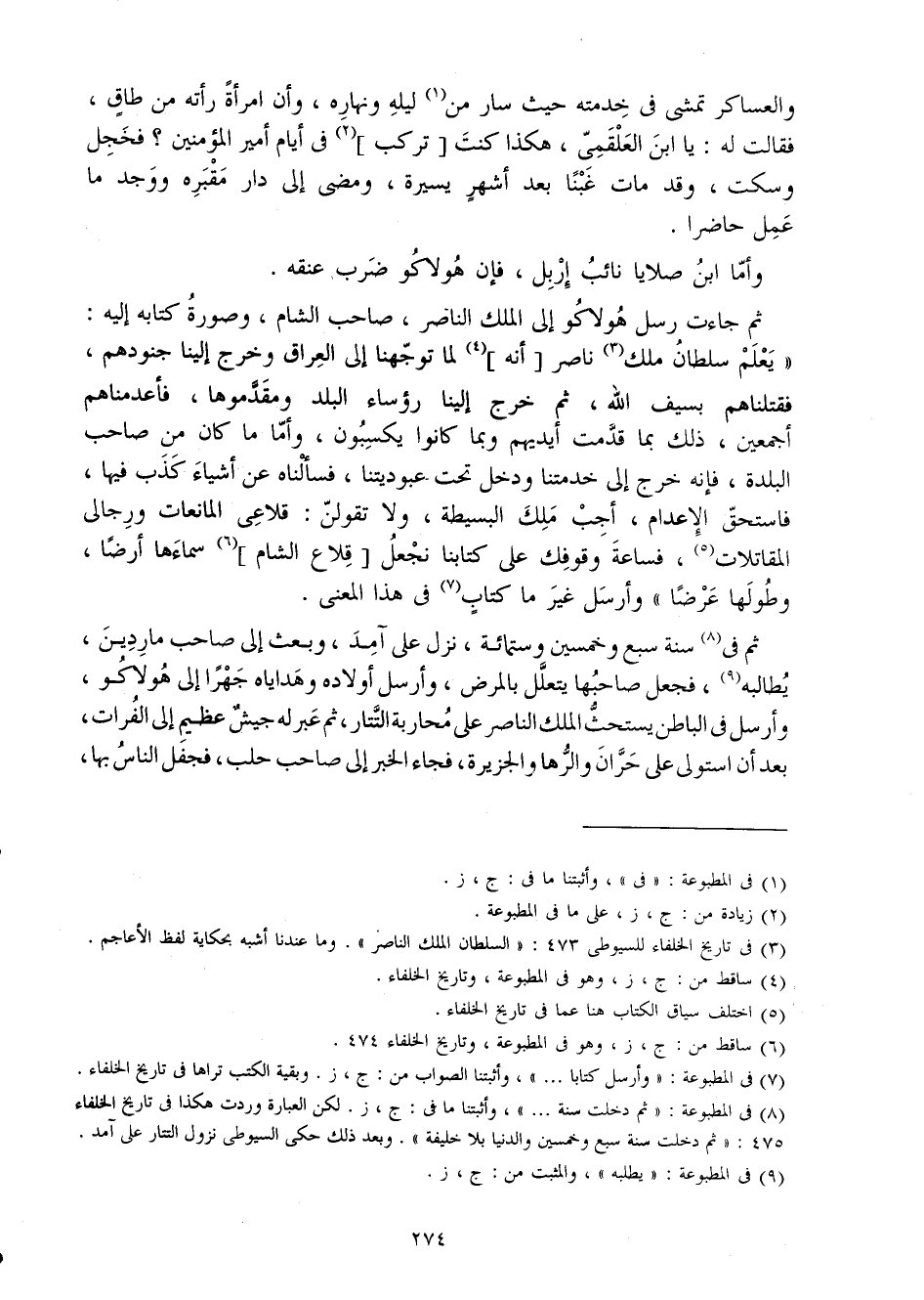 ثمَّ جَاءَت رسل هولاكو إِلَى الْملك النَّاصِر صَاحب الشَّام وَصُورَة كِتَابه إِلَيْهِ يعلم سُلْطَان ملك نَاصِر أَنه لما توجهنا إِلَى الْعرَاق وَخرج إِلَيْنَا جنودهم فقتلناهم بِسيف الله ثمَّ خرج إِلَيْنَا رُؤَسَاء الْبَلَد ومقدموها فأعدمناهم أَجْمَعِينَ ذَلِك بِمَا قدمت أَيْديهم وَبِمَا كَانُوا يَكْسِبُونَ وَأما مَا كَانَ من صَاحب الْبَلدة فَإِنَّهُ خرج إِلَى خدمتنا وَدخل تَحت عبوديتنا فَسَأَلْنَاهُ عَن أَشْيَاء كذب فِيهَا فَاسْتحقَّ الإعدام أجب ملك البسيطة وَلَا تقولن قلاعي المانعات ورجالي المقاتلات فساعة وقوفك على كتَابنَا نجْعَل قلاع الشَّام سماءها أَرضًا وطولها عرضا وَأرْسل غير مَا كتاب فِي هَذَا الْمَعْنى