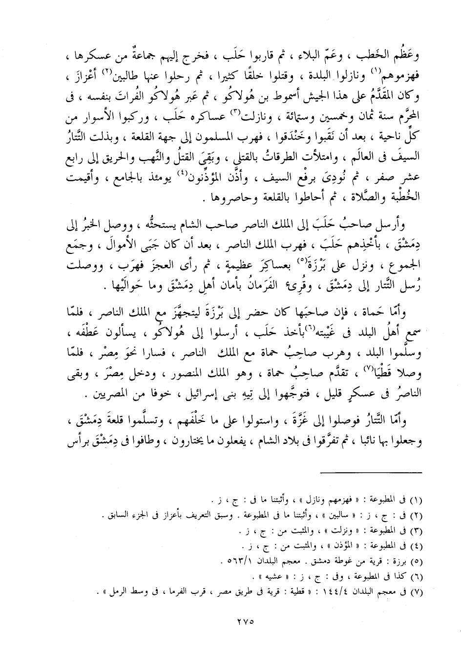 وَعظم الْخطب وَعم الْبلَاء ثمَّ قاربوا حلب فَخرج إِلَيْهِم جمَاعَة من عسكرها فهزموهم ونازلوا الْبَلدة وَقتلُوا خلقا كثيرا ثمَّ رحلوا عَنْهَا طَالِبين أعزاز وَكَانَ الْمُقدم على هَذَا الْجَيْش أسموط بن هولاكو ثمَّ عبر هولاكو الْفُرَات بِنَفسِهِ فِي الْمحرم سنة ثَمَان وَخمسين وسِتمِائَة ونازلت عساكره حلب وركبوا الأسوار من كل نَاحيَة بعد أَن نقبوا وخندقوا فهرب الْمُسلمُونَ إِلَى جِهَة القلعة وبذلت التتار السَّيْف فِي الْعَالم وامتلأت الطرقات بالقتلى وَبَقِي الْقَتْل والنهب والحريق إِلَى رَابِع عشر صفر ثمَّ نُودي بِرَفْع السَّيْف وَأذن المؤذنون يَوْمئِذٍ بالجامع وأقيمت الْخطْبَة وَالصَّلَاة ثمَّ أحاطوا بالقلعة وحاصروها