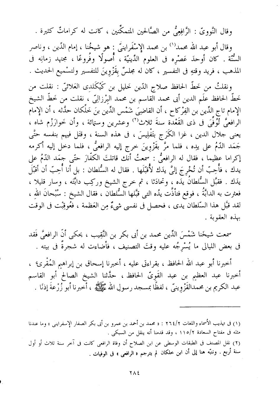 ونقلت من خطّ الْحَافِظ صَلَاح الدّين خَلِيل بن كيكلدي العلائي نقلت من خطّ الْحَافِظ علم الدّين أبي مُحَمَّد الْقَاسِم بن مُحَمَّد البرزالي نقلت من خطّ الشَّيْخ الإِمَام تَاج الدّين بن الفركاح أَن القَاضِي شمس الدّين بن خلكان حَدثهُ أَن الإِمَام الرَّافِعِيّ توفّي فِي ذِي الْقعدَة سنة ثَلَاث وَعشْرين وسِتمِائَة وَأَن خوارزم شاه يَعْنِي جلال الدّين غزا الكرج بتفليس فِي هَذِه السّنة وَقتل فيهم بِنَفسِهِ حَتَّى جمد الدَّم على يَده فَلَمَّا مر بقزوين خرج إِلَيْهِ الرَّافِعِيّ فَلَمَّا دخل إِلَيْهِ أكْرمه إِكْرَاما عَظِيما فَقَالَ لَهُ الرَّافِعِيّ سَمِعت أَنَّك قَاتَلت الْكفَّار حَتَّى جمد الدَّم على يدك فَأحب أَن تخرج إِلَيّ يدك لأقبلها فَقَالَ لَهُ السُّلْطَان بل أَنا أحب أَن أقبل يدك فَقبل السُّلْطَان يَده وتحادثا ثمَّ خرج الشَّيْخ وَركب دَابَّته وَسَار قَلِيلا فَعَثَرَتْ بِهِ الدَّابَّة فَوَقع فتأذت يَده الَّتِي قبلهَا السُّلْطَان فَقَالَ الشَّيْخ سُبْحَانَ الله لقد قبل هَذَا السُّلْطَان يَدي فَحصل فِي نَفسِي شَيْء من العظمة فعوقبت فِي الْوَقْت بِهَذِهِ الْعقُوبَة