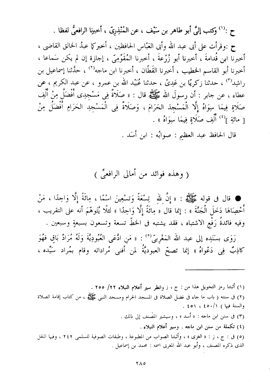 ح وقرأت على أبي عبد الله وَأبي الْعَبَّاس الحافظين أخبركما عبد الْخَالِق القَاضِي أخبرنَا ابْن قدامَة أخبرنَا أَبُو زرْعَة أخبرنَا المقومي إجَازَة إِن لم يكن سَمَاعا أخبرنَا أَبُو الْقَاسِم الْخَطِيب أخبرنَا الْقطَّان أخبرنَا ابْن مَاجَه حَدثنَا إِسْمَاعِيل بن رَاشد حَدثنَا زَكَرِيَّا بن عدي حَدثنَا عبيد الله بن عَمْرو عَن عبد الْكَرِيم عَن عَطاء عَن جَابر أَن رَسُول الله صلى الله عَلَيْهِ وَسلم قَالَ صَلَاة فِي مَسْجِدي أفضل من ألف صَلَاة فِيمَا سواهُ إِلَّا الْمَسْجِد الْحَرَام وَصَلَاة فِي الْمَسْجِد الْحَرَام أفضل من مائَة ألف صَلَاة فِيمَا سواهُ