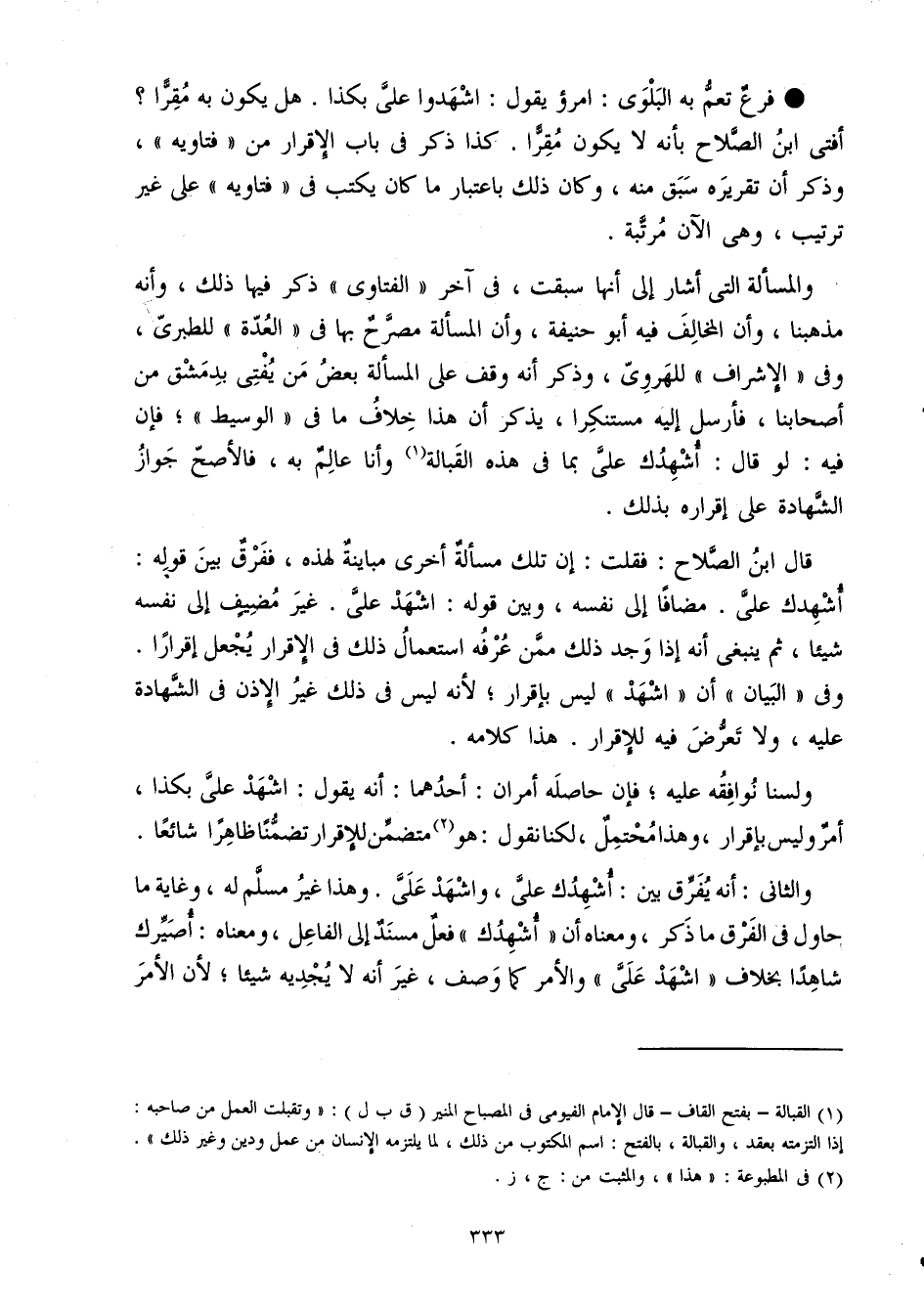 وَالْمَسْأَلَة الَّتِي أَشَارَ إِلَى أَنَّهَا سبقت فِي آخر الْفَتَاوَى ذكر فِيهَا ذَلِك وَأَنه مَذْهَبنَا وَأَن الْمُخَالف فِيهِ أَبُو حنيفَة وَأَن الْمَسْأَلَة مُصَرح بهَا فِي الْعدة للطبري وَفِي الإشراف للهروي وَذكر أَنه وقف على الْمَسْأَلَة بعض من يُفْتِي بِدِمَشْق من أَصْحَابنَا فَأرْسل إِلَيْهِ مستنكرا يذكر أَن هَذَا خلاف مَا فِي الْوَسِيط فَإِن فِيهِ لَو قَالَ أشهدك عَليّ بِمَا فِي هَذِه القبالة وَأَنا عَالم بِهِ فَالْأَصَحّ جَوَاز الشَّهَادَة على إِقْرَاره بذلك
