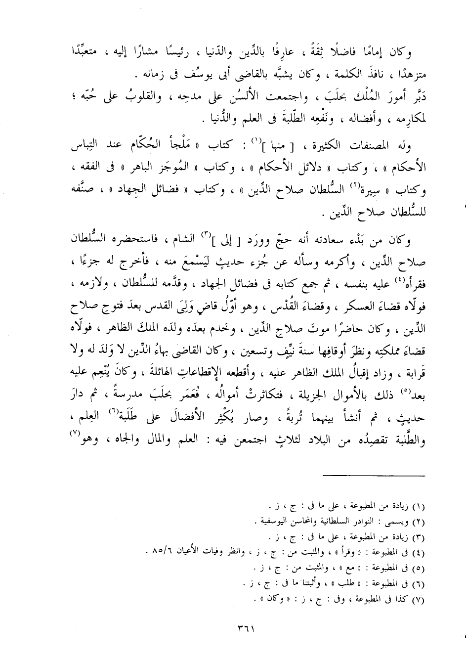 وَكَانَ من بَدْء سعادته أَنه حج وَورد إِلَى الشَّام فَاسْتَحْضرهُ السُّلْطَان صَلَاح الدّين وأكرمه وَسَأَلَهُ عَن جُزْء حَدِيث ليسمع مِنْهُ فَأخْرج لَهُ جُزْءا فقرأه عَلَيْهِ بِنَفسِهِ ثمَّ جمع كِتَابه فِي فَضَائِل الْجِهَاد وَقدمه للسُّلْطَان ولازمه فولاه قَضَاء الْعَسْكَر وَقَضَاء الْقُدس وَهُوَ أول قَاض ولي الْقُدس بعد فتوح صَلَاح الدّين وَكَانَ حَاضرا موت صَلَاح الدّين وخدم بعده وَلَده الْملك الظَّاهِر فولاه قَضَاء مَمْلَكَته وَنظر أوقافها سنة نَيف وَتِسْعين وَكَانَ القَاضِي بهاء الدّين لَا ولد لَهُ وَلَا قرَابَة وَزَاد إقبال الْملك الظَّاهِر عَلَيْهِ وأقطعه الإقطاعات الهائلة وَكَانَ ينعم عَلَيْهِ بعد ذَلِك بالأموال الجزيلة فتكاثرت أَمْوَاله فعمر بحلب مدرسة ثمَّ دَار حَدِيث ثمَّ أنشأ بَينهمَا تربة وَصَارَ يكثر الأفضال على طلبة الْعلم والطلبة تقصده من الْبِلَاد لثلاث اجْتَمعْنَ فِيهِ الْعلم وَالْمَال والجاه وَهُوَ