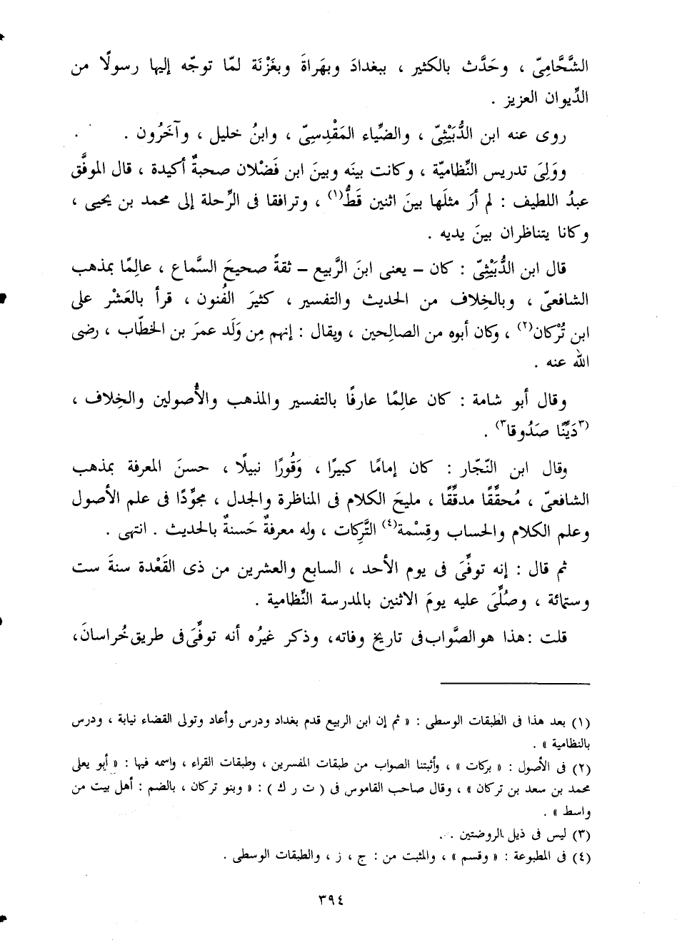 وَقَالَ ابْن النجار كَانَ إِمَامًا كَبِيرا وقورا نبيلا حسن الْمعرفَة بِمذهب الشَّافِعِي محققا مدققا مليح الْكَلَام فِي المناظرة والجدل مجودا فِي علم الْأُصُول وَعلم الْكَلَام والحساب وَقِسْمَة التركات وَله معرفَة حَسَنَة بِالْحَدِيثِ انْتهى