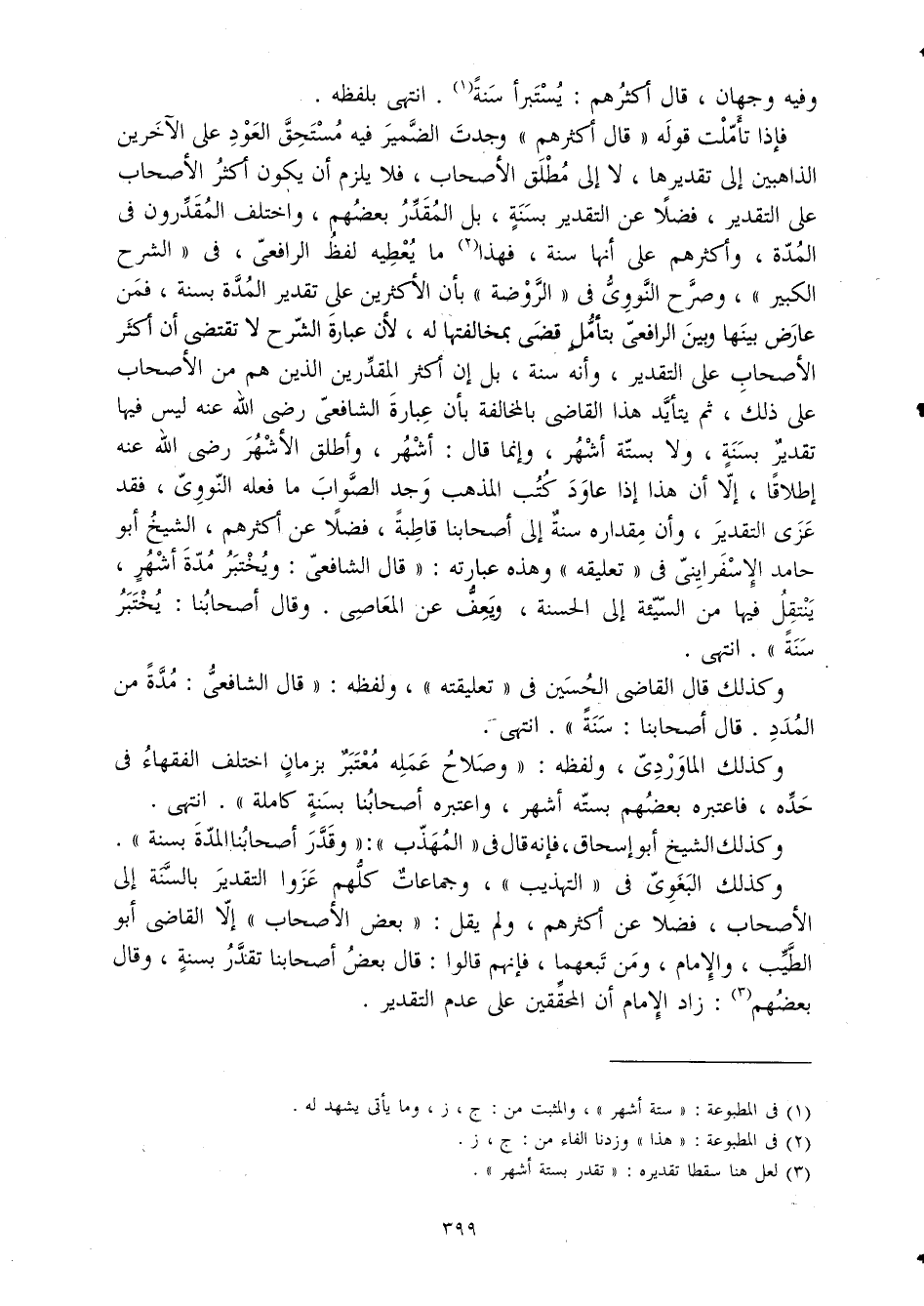 وَكَذَلِكَ الْبَغَوِيّ فِي التَّهْذِيب وجماعات كلهم عزوا التَّقْدِير بِالسنةِ إِلَى الْأَصْحَاب فضلا عَن أَكْثَرهم وَلم يقل بعض الْأَصْحَاب إِلَّا القَاضِي أَبُو الطّيب وَالْإِمَام وَمن تبعهما فَإِنَّهُم قَالُوا قَالَ بعض أَصْحَابنَا تقدر بِسنة وَقَالَ بَعضهم زَاد الإِمَام أَن الْمُحَقِّقين على عدم التَّقْدِير