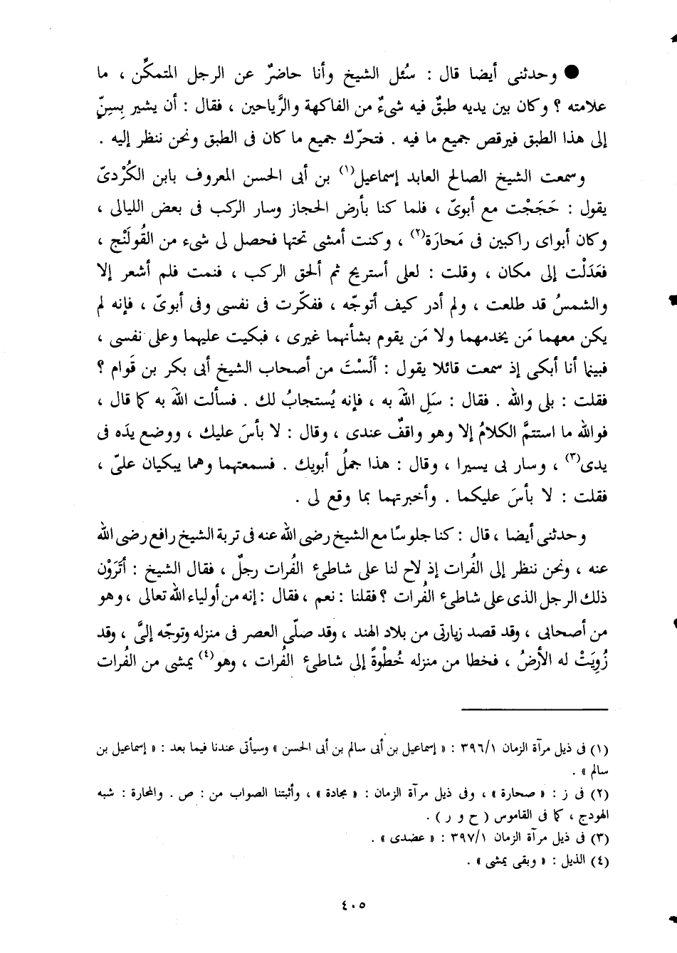 وحَدثني أَيْضا قَالَ كُنَّا جُلُوسًا مَعَ الشَّيْخ رَضِي الله عَنهُ فِي تربة الشَّيْخ رَافع رَضِي الله عَنهُ وَنحن نَنْظُر إِلَى الْفُرَات إِذْ لَاحَ لنا على شاطئ الْفُرَات رجل فَقَالَ الشَّيْخ أَتَرَوْنَ ذَلِك الرجل الَّذِي على شاطئ الْفُرَات فَقُلْنَا نعم فَقَالَ إِنَّه من أَوْلِيَاء الله تَعَالَى وَهُوَ من أَصْحَابِي وَقد قصد زيارتي من بِلَاد الْهِنْد وَقد صلى الْعَصْر فِي منزله وَتوجه إِلَيّ وَقد زويت لَهُ الأَرْض فخطا من منزله خطْوَة إِلَى شاطئ الْفُرَات وَهُوَ يمشي من الْفُرَات