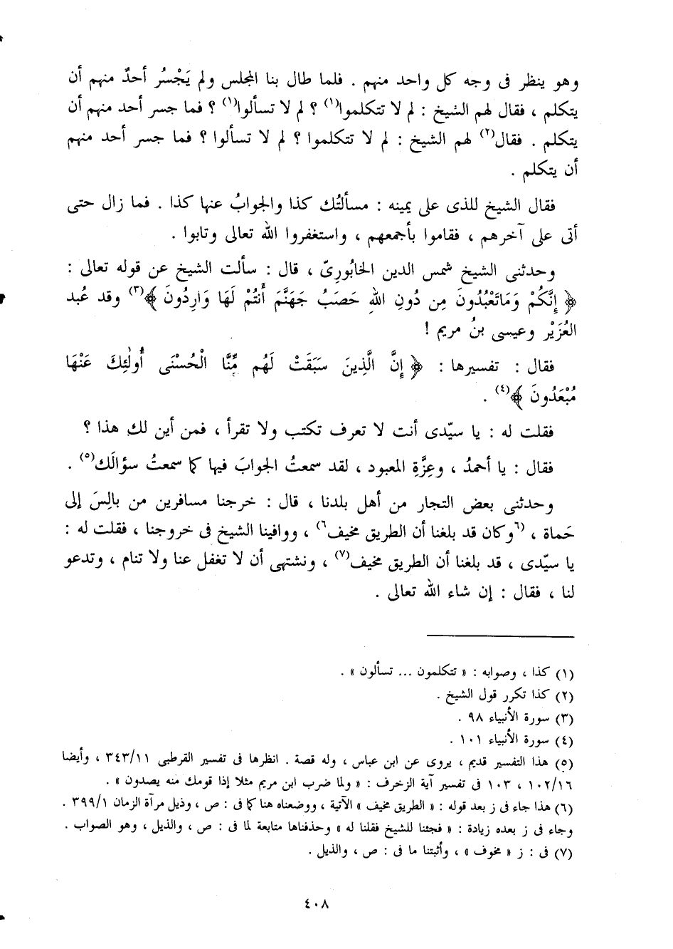 وحَدثني الشَّيْخ شمس الدّين الخابوري قَالَ سَأَلت الشَّيْخ عَن قَوْله تَعَالَى {إِنَّكُم وَمَا تَعْبدُونَ من دون الله حصب جَهَنَّم أَنْتُم لَهَا وَارِدُونَ} وَقد عبد الْعَزِيز وَعِيسَى بن مَرْيَم