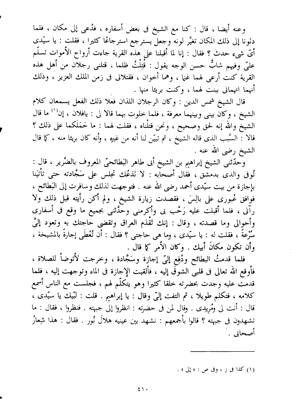 وحَدثني الشَّيْخ إِبْرَاهِيم بن الشَّيْخ أبي طَاهِر البطائحي الْمَعْرُوف بالضرير قَالَ توفّي وَالِدي بِدِمَشْق فَقَالَ أَصْحَابه لَا نَدعك تجْلِس على سجادته حَتَّى تَأْتِينَا بِإِجَازَة من بَيت سَيِّدي أَحْمد رَضِي الله عَنهُ فتوجهت لذَلِك وسافرت إِلَى البطائح فَوَافَقَ عبوري على بالس فقصدت زِيَارَة الشَّيْخ وَلم أكن رَأَيْته قبل ذَلِك وَلَا رَآنِي فَلَمَّا أَقبلت عَلَيْهِ رحب بِي وأكرمني وحَدثني بِجَمِيعِ مَا وَقع فِي أسفاري وأحوالي وَمَا قصدته وَقَالَ إِنَّك تقدم الْعرَاق وتقضي حَاجَتك بِهِ وتعود إِلَيّ سرعَة فَقلت لَهُ يَا سَيِّدي وَمَا هِيَ حَاجَتي فَقَالَ أَن تُعْطى إجَازَة بالمشيخة وَأَن تكون مَكَان أَبِيك وَكَانَ الْأَمر كَمَا قَالَ