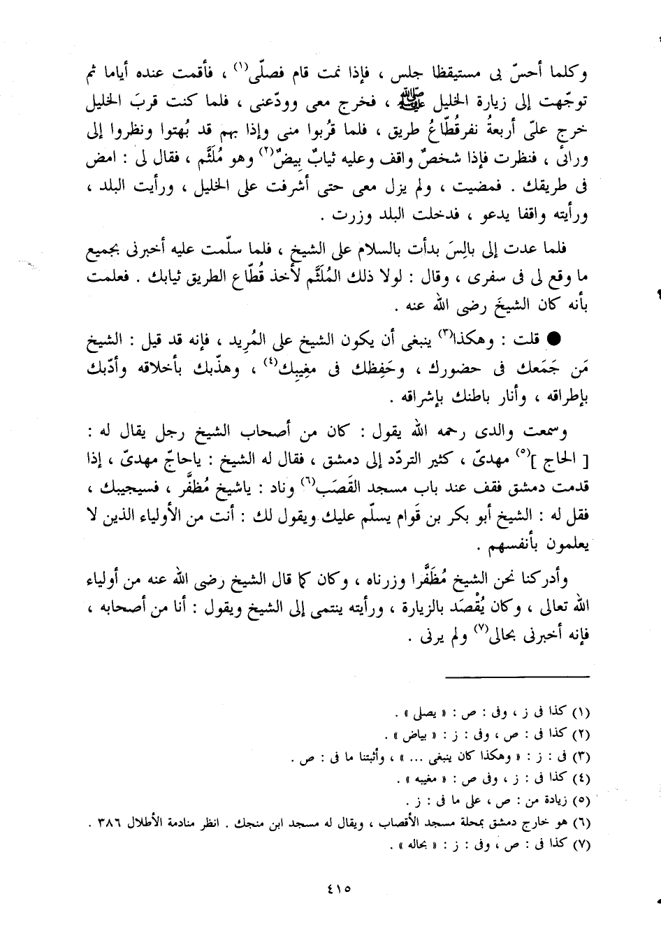 وَكلما أحس بِي مستقيضا جلس فَإِذا نمت قَامَ فصلى فأقمت عِنْده أَيَّامًا ثمَّ تَوَجَّهت رإلى زِيَارَة الْخَلِيل صلى الله عَلَيْهِ وَسلم فَخرج معي وودعني فَلَمَّا كنت قرب الْخَلِيل خرج عَليّ أَرْبَعَة نفر قطاع طَرِيق فَلَمَّا قربوا مني وَإِذا بهم قد بهتُوا ونظروا إِلَى ورائي فَنَظَرت فَإِذا شخص وَاقِف وَعَلِيهِ ثِيَاب بيض وَهُوَ ملثم فَقَالَ لي امْضِ فِي طريقك فمضيت وَلم يزل معي حَتَّى أشرفت على الْخَلِيل وَرَأَيْت الْبَلَد ورأيته وَاقِفًا يَدْعُو فَدخلت الْبَلَد وزرت
