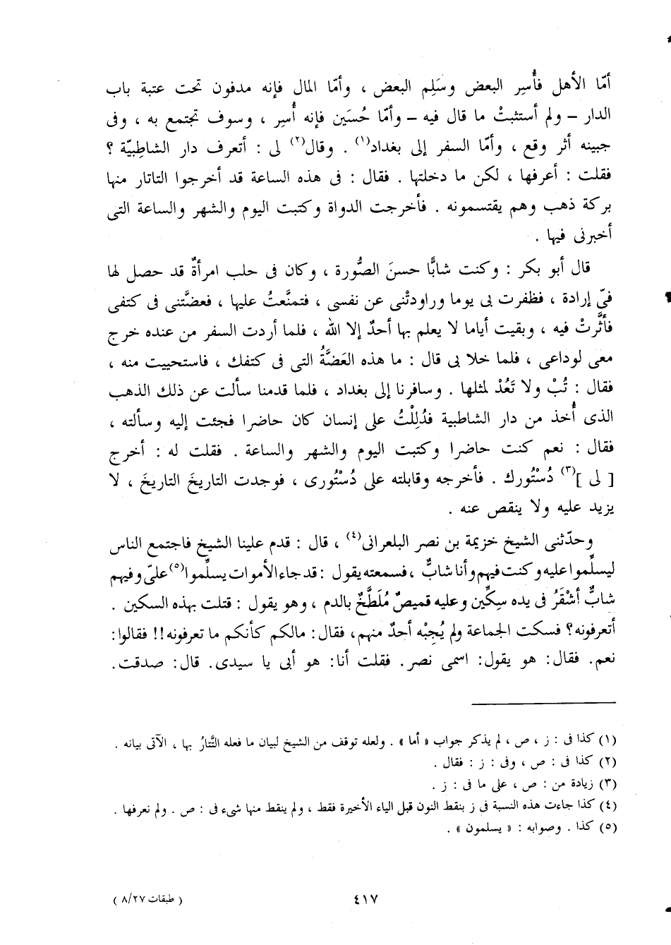 أما الْأَهْل فَأسر الْبَعْض وَسلم الْبَعْض وَأما المَال فَإِنَّهُ مدفون تَحت عتبَة بَاب الدَّار وَلم أستثبت مَا قَالَ فِيهِ وَأما حُسَيْن فَإِنَّهُ أسر وسوف تَجْتَمِع بِهِ وَفِي جَبينه أثر وَقع وَأما السّفر إِلَى بَغْدَاد وَقَالَ لي أتعرف دَار الشاطبية فَقلت أعرفهَا لَكِن مَا دختلها فَقَالَ فِي هَذِه السَّاعَة قد أخرجُوا التاتار مِنْهَا بركَة ذهب وهم يقتسمونه فأخرجت الدواة وكتبت الْيَوْم والشهر والساعة الَّتِي أَخْبرنِي فِيهَا