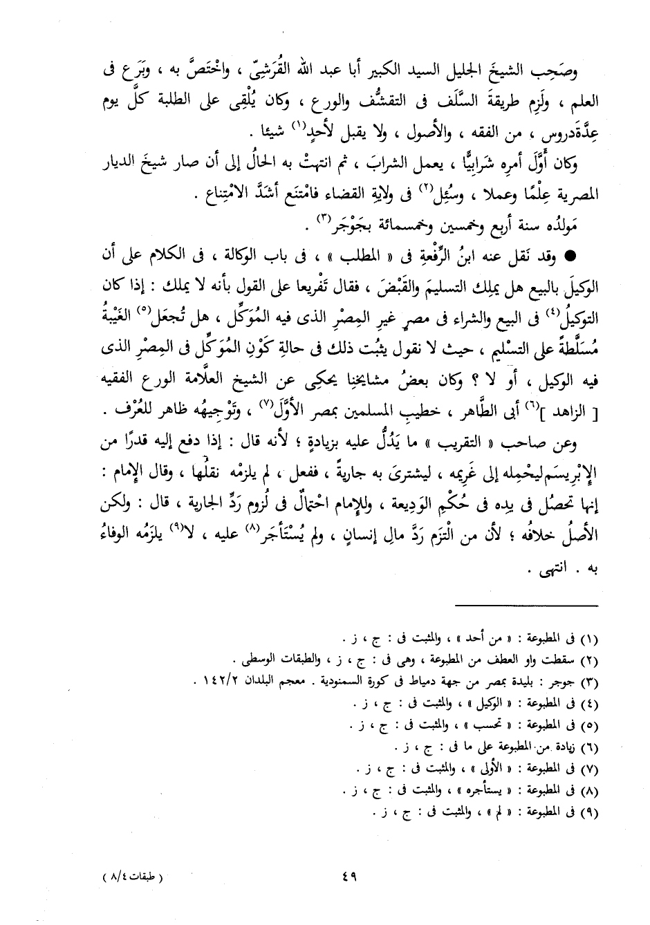 وَقد نقل عَنهُ ابْن الرّفْعَة فِي الْمطلب فِي بَاب الْوكَالَة فِي الْكَلَام على أَن الْوَكِيل بِالْبيعِ هَل يملك التَّسْلِيم وَالْقَبْض فَقَالَ تَفْرِيعا على القَوْل بِأَنَّهُ لَا يملك إِذا كَانَ التَّوْكِيل فِي البيع وَالشِّرَاء فِي مصر غير الْمصر الَّذِي فِيهِ الْمُوكل هَل تجْعَل الْغَيْبَة مسلطة على التَّسْلِيم حَيْثُ لَا نقُول يثبت ذَلِك فِي حَالَة كَون الْمُوكل فِي الْمصر الَّذِي فِيهِ الْوَكِيل أَو لَا وَكَانَ بعض مَشَايِخنَا يَحْكِي عَن الشَّيْخ الْعَلامَة الْوَرع الْفَقِيه الزَّاهِد أبي الطَّاهِر خطيب الْمُسلمين بِمصْر الأول وتوجيهه ظَاهر للْعُرْف
