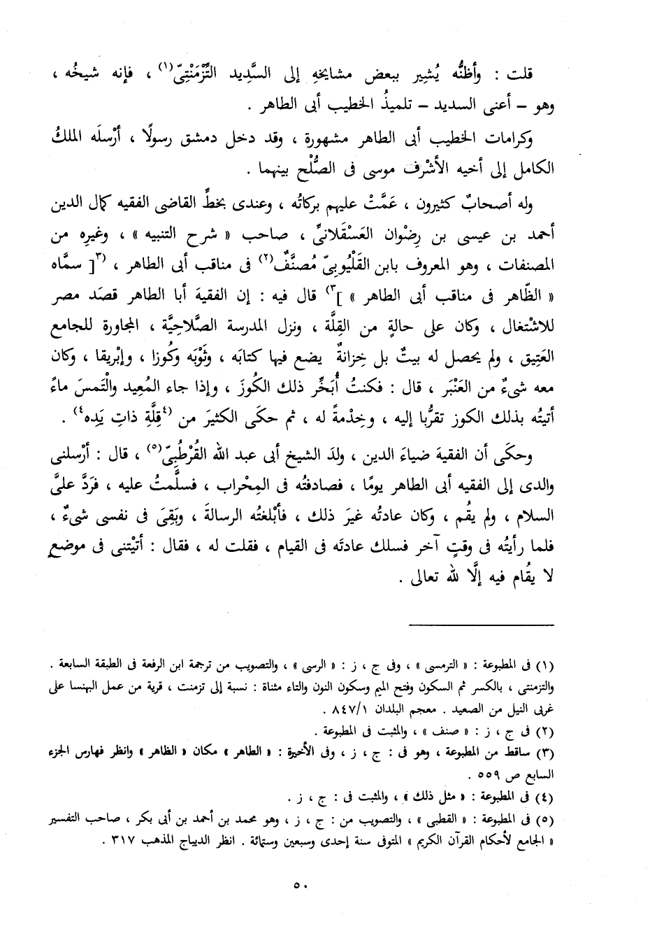 وَله أَصْحَاب كَثِيرُونَ عَمت عَلَيْهِم بركاته وَعِنْدِي بِخَط القَاضِي الْفَقِيه كَمَال الدّين أَحْمد بن عِيسَى بن رضوَان الْعَسْقَلَانِي صَاحب شرح التَّنْبِيه وَغَيره من المصنفات وَهُوَ الْمَعْرُوف بِابْن القليوبي مُصَنف فِي مَنَاقِب أبي الطَّاهِر سَمَّاهُ الظَّاهِر فِي مَنَاقِب أبي الطَّاهِر قَالَ فِيهِ إِن الْفَقِيه أَبَا الطَّاهِر قصد مصر للاشتغال وَكَانَ على حَالَة من الْقلَّة وَنزل الْمدرسَة الصلاحية الْمُجَاورَة للجامع الْعَتِيق وَلم يحصل لَهُ بَيت بل خزانَة يضع فِيهَا كِتَابه وثوبه وكوزا وإبريقا وَكَانَ مَعَه شَيْء من العنبر قَالَ فَكنت أبخر ذَلِك الْكوز وَإِذا جَاءَ المعيد وَالْتمس مَاء أَتَيْته بذلك الْكوز تقربا إِلَيْهِ وخدمة لَهُ ثمَّ حكى الْكثير من قلَّة ذَات يَده