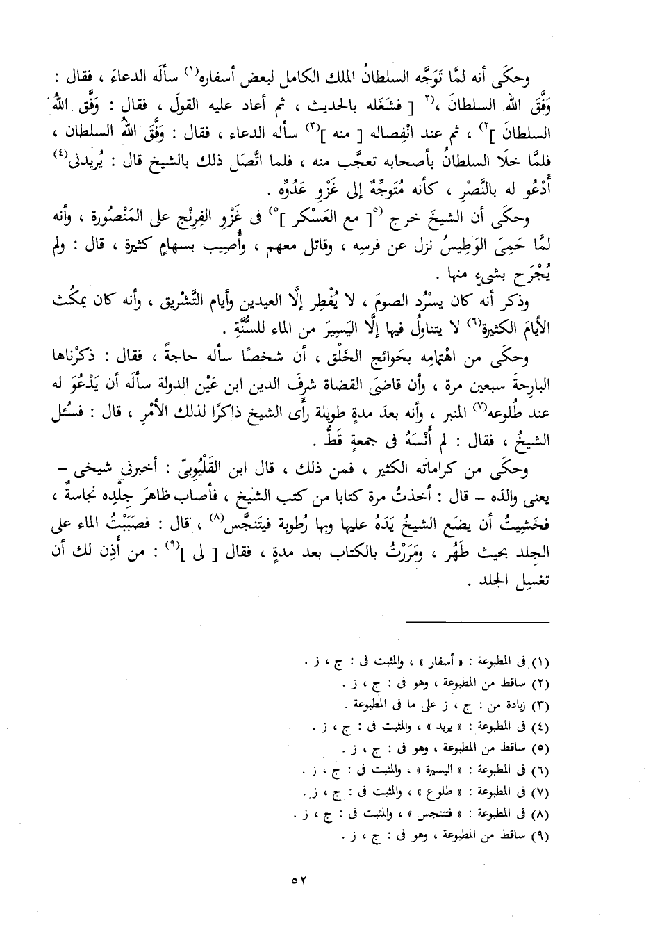 وَحكى من كراماته الْكثير فَمن ذَلِك قَالَ ابْن القليوبي أَخْبرنِي شَيْخي - يَعْنِي وَالِده - قَالَ أخذت مرّة كتابا من كتب الشَّيْخ فَأصَاب ظَاهر جلده نَجَاسَة فَخَشِيت أَن يضع الشَّيْخ يَده عَلَيْهَا وَبهَا رُطُوبَة فيتنجس قَالَ فَصَبَبْت المَاء على الْجلد بِحَيْثُ طهر ومررت بِالْكتاب بعد مُدَّة فَقَالَ لي من أذن لَك أَن تغسل الْجلد