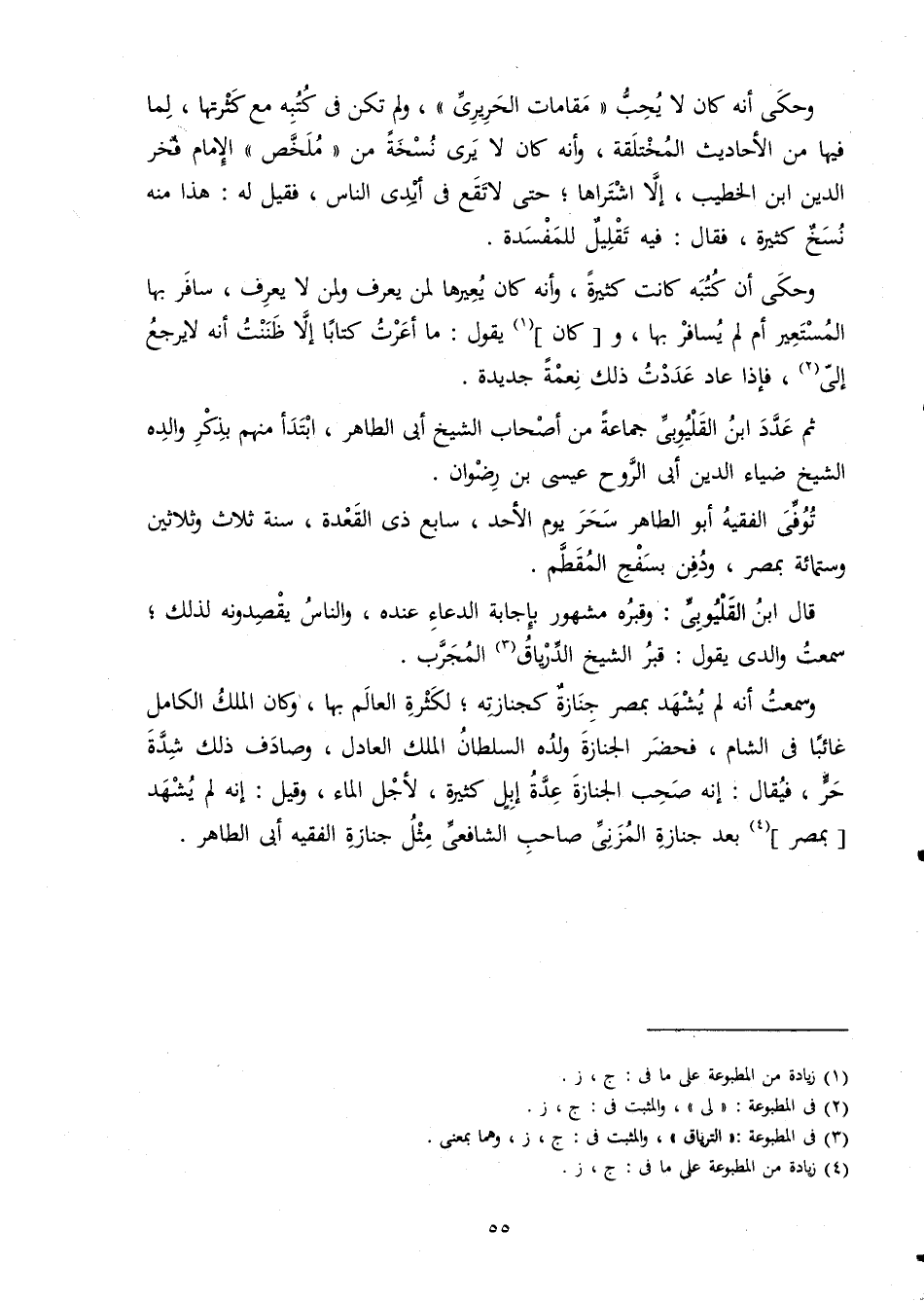 وَسمعت أَنه لم يشْهد بِمصْر جَنَازَة كجنازته لِكَثْرَة الْعَالم بهَا وَكَانَ الْملك الْكَامِل غَائِبا فِي الشَّام فَحَضَرَ الْجِنَازَة وَلَده السُّلْطَان الْملك الْعَادِل وصادف ذَلِك شدَّة حر فَيُقَال إِنَّه صحب الْجِنَازَة عدَّة إبل كَثِيرَة لأجل المَاء وَقيل إِنَّه لم يشْهد بِمصْر بعد جَنَازَة الْمُزنِيّ صَاحب الشَّافِعِي مثل جَنَازَة الْفَقِيه أبي الطَّاهِر