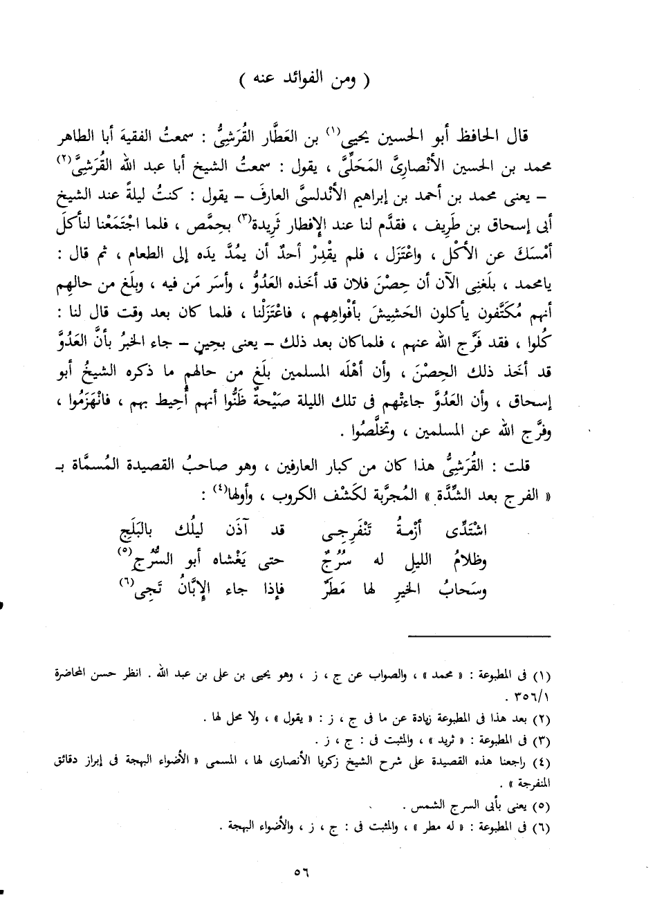 قلت الْقرشِي هَذَا كَانَ من كبار العارفين وَهُوَ صَاحب القصيدة الْمُسَمَّاة ب الْفرج بعد الشدَّة المجربة لكشف الكروب وأولها