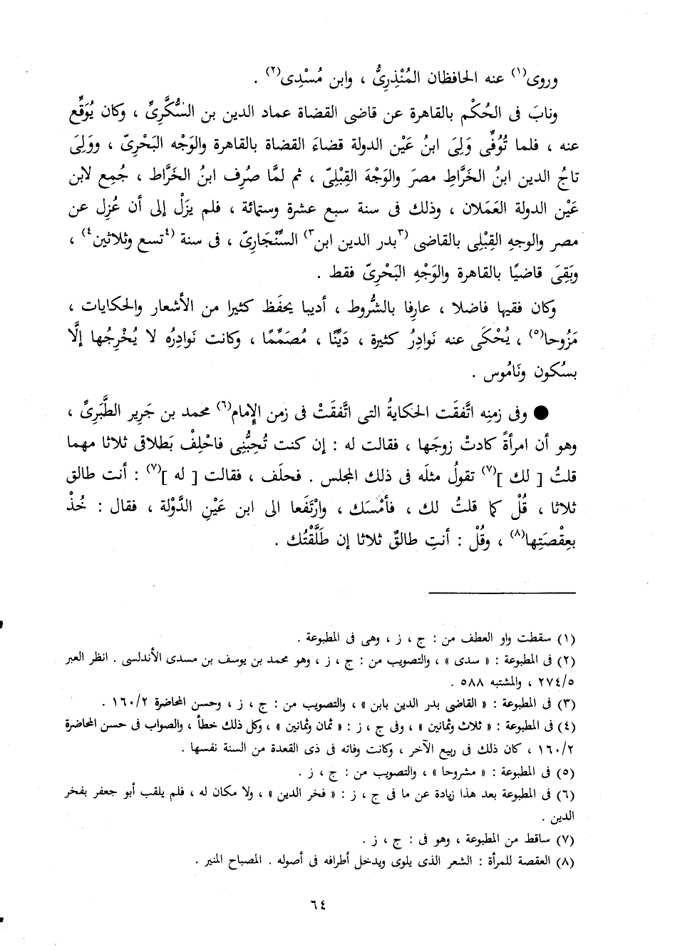 وَفِي زَمَنه اتّفقت الْحِكَايَة الَّتِي اتّفقت فِي زمن الإِمَام مُحَمَّد بن جرير الطَّبَرِيّ وَهُوَ أَن أمْرَأَة كَادَت زَوجهَا فَقَالَت لَهُ إِن كنت تحبني فاحلف بطلاقي ثَلَاثًا مهما قلت لَك تَقول مثله فِي ذَلِك الْمجْلس فَحلف فَقَالَت لَهُ أَنْت طَالِق ثَلَاثًا قل كَمَا قلت لَك فَأمْسك وارتفعا إِلَى ابْن عين الدولة فَقَالَ خُذ بعقصتها وَقل أَنْت طَالِق ثَلَاثًا إِن طَلقتك