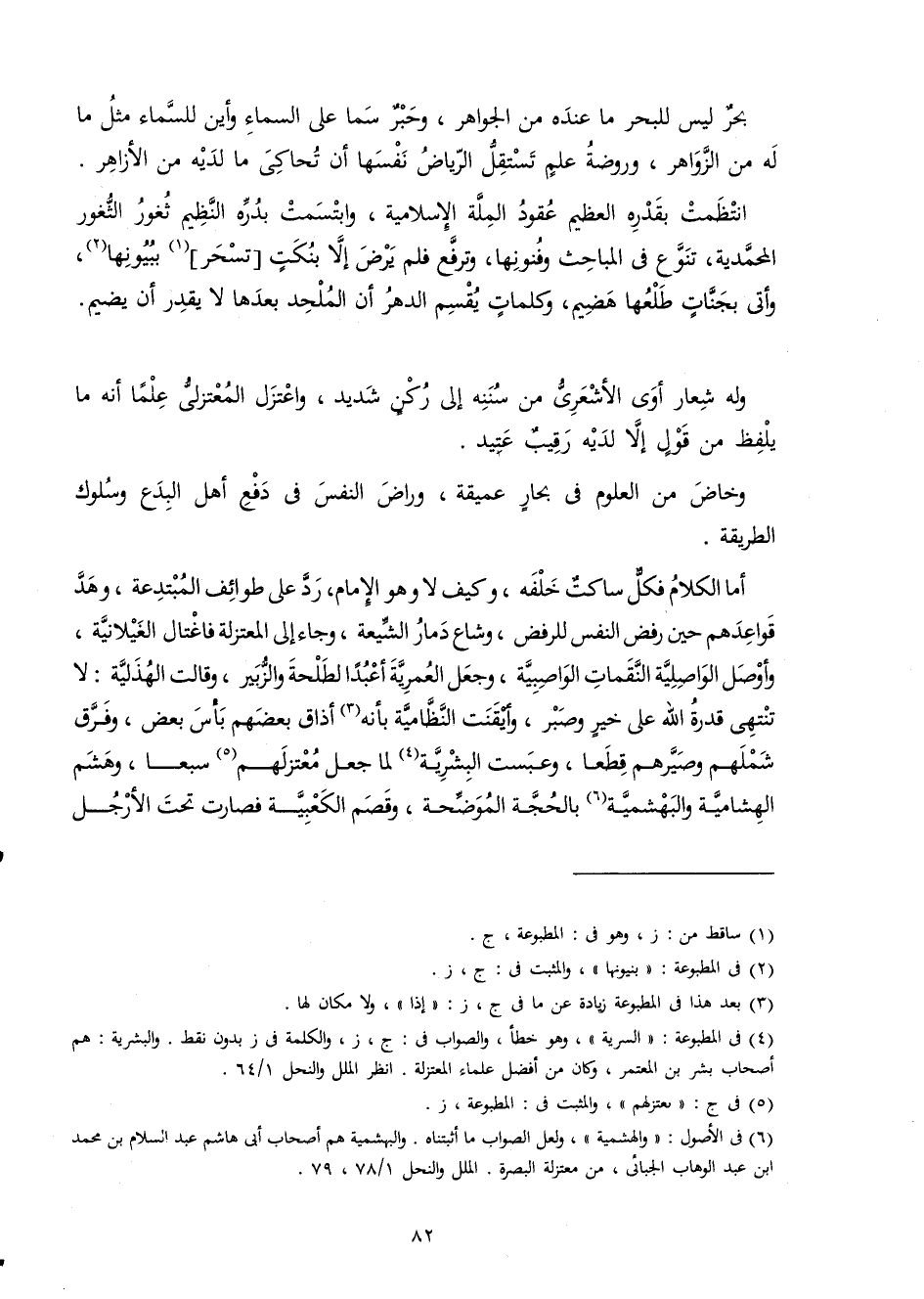 أما الْكَلَام فَكل سَاكِت خَلفه وَكَيف لَا وَهُوَ الإِمَام رد على طوائف المبتدعة وهد قواعدهم حِين رفض النَّفس للرفض وشاع دمار الشِّيعَة وَجَاء إِلَى الْمُعْتَزلَة فاغتال الغيلانية وأوصل الواصلية النقمات الواصبية وَجعل العمرية أعبدا لطلْحَة وَالزُّبَيْر وَقَالَت الهذلية لَا تَنْتَهِي قدرَة الله على خير وصبر وأيقنت النظامية بِأَنَّهُ أذاق بَعضهم بَأْس بعض وَفرق شملهم وصيرهم قطعا وعبست البشرية لما جعل معتزلهم سبعا وهشم الهشامية والبهشمية بِالْحجَّةِ الْمُوَضّحَة وقصم الْكَعْبِيَّة فَصَارَت تَحت الأرجل