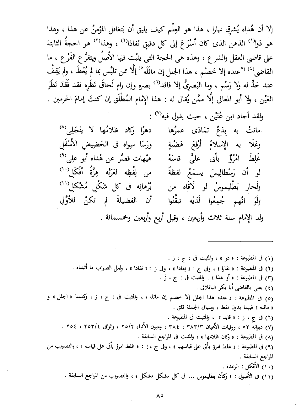 إِلَّا أَن هداه يشرق نَهَارا هَذَا هُوَ الْعلم كَيفَ يَلِيق أَن يتغافل الْمُؤمن عَن هَذَا وَهَذَا هُوَ دوا الذِّهْن الَّذِي كَانَ أسْرع إِلَى كل دَقِيق نفاذا وَهَذَا هُوَ الْحجَّة الثَّابِتَة على قَاضِي الْعقل وَالشَّرْع وَهَذِه هِيَ الْحجَّة الَّتِي يثبت فِيهَا الأَصْل وَيتَفَرَّع الْفَرْع مَا القَاضِي عِنْده إِلَّا خصم هَذَا الجلل إِن ماثله إِلَّا مِمَّن تلبس بِمَا لم يُعْط وَلم يقف عِنْد حد لَهُ وَلَا رسم وَمَا الْبَصْرِيّ إِلَّا فَاقِد بَصَره وَإِن رام لحاق نظره فقد فقد نظر الْعين وَلَا أَبُو الْمَعَالِي إِلَّا مِمَّن يُقَال لَهُ هَذَا الإِمَام الْمُطلق إِن كنت إِمَام الْحَرَمَيْنِ