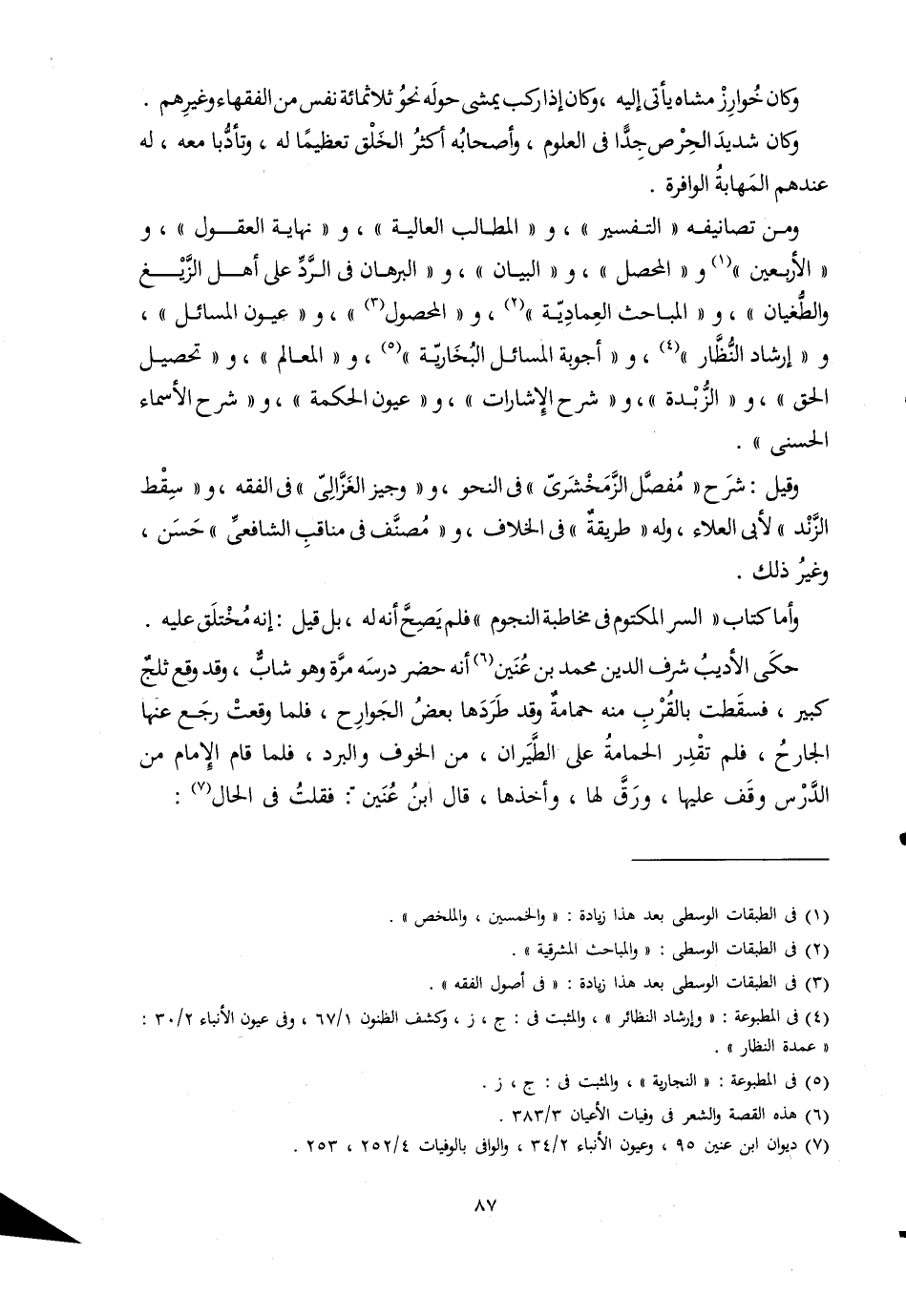 وَقيل شرح مفصل الزَّمَخْشَرِيّ فِي النَّحْو ووجيز الْغَزالِيّ فِي الْفِقْه وَسقط الزند لأبي الْعَلَاء وَله طَريقَة فِي الْخلاف ومُصَنف فِي مَنَاقِب الشَّافِعِي حسن وَغير ذَلِك