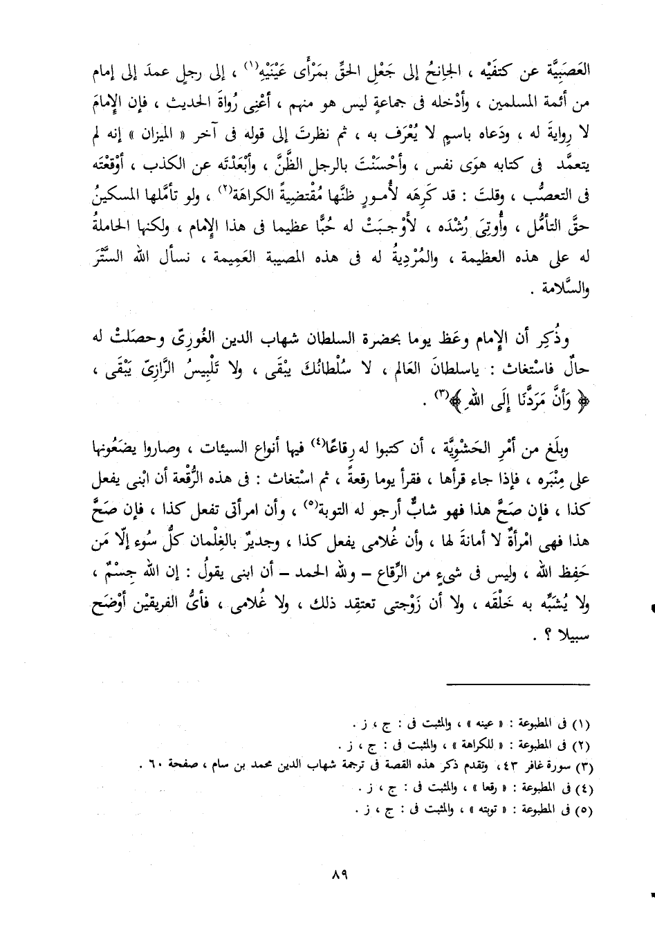العصبية عَن كَتفيهِ الجانح إِلَى جعل الْحق بمرأى عَيْنَيْهِ إِلَى رجل عمد إِلَى إِمَام من أَئِمَّة الْمُسلمين وَأدْخلهُ فِي جمَاعَة لَيْسَ هُوَ مِنْهُم أَعنِي رُوَاة الحَدِيث فَإِن الإِمَام لَا رِوَايَة لَهُ وَدعَاهُ باسم لَا يعرف بِهِ ثمَّ نظرت إِلَى قَوْله فِي آخر الْمِيزَان إِنَّه لم يتَعَمَّد فِي كِتَابه هوى نفس وأحسنت بِالرجلِ الظَّن وأبعدته عَن الْكَذِب أوقعته فِي التعصب وَقلت قد كرهه لأمور ظَنّهَا مقتضية الْكَرَاهَة وَلَو تأملها الْمِسْكِين حق التَّأَمُّل وأوتي رشده لأوجبت لَهُ حبا عَظِيما فِي هَذَا الإِمَام وَلكنهَا الحاملة لَهُ على هَذِه الْعَظِيمَة والمردية لَهُ فِي هَذِه الْمُصِيبَة العميمة نسْأَل الله السّتْر والسلامة