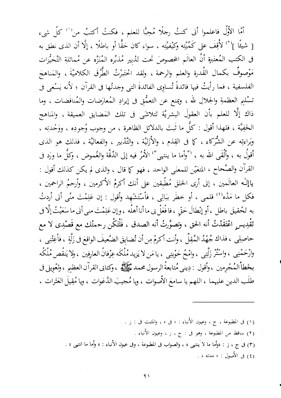 أما الأول فاعلموا أَنِّي كنت رجلا محبا للْعلم فَكنت أكتب من كل شَيْء شَيْئا لأقف على كميته وكيفيته سَوَاء كَانَ حَقًا أَو بَاطِلا إِلَّا أَن الَّذِي نطق بِهِ فِي الْكتب الْمُعْتَبرَة أَن الْعَالم الْمَخْصُوص تَحت تَدْبِير مدبره المنزه عَن مماثلة التحيزات مَوْصُوف بِكَمَال الْقُدْرَة وَالْعلم وَالرَّحْمَة وَلَقَد اختبرت الطّرق الكلامية والمناهج الفلسفية فَمَا رَأَيْت فِيهَا فَائِدَة تَسَاوِي الْفَائِدَة الَّتِي وَجدتهَا فِي الْقُرْآن لِأَنَّهُ يسْعَى فِي تَسْلِيم العظمة والجلال لله وَيمْنَع عَن التعمق فِي إِيرَاد المعارضات والمناقضات وَمَا ذَاك إِلَّا للْعلم بِأَن الْعُقُول البشرية تتلاشى فِي تِلْكَ المضايق العميقة والمناهج الْخفية فَلهَذَا أَقُول كل مَا ثَبت بالدلائل الظَّاهِرَة من وجوب وجوده ووحدته وبراءته عَن الشُّرَكَاء كَمَا فِي الْقدَم والأزلية وَالتَّدْبِير والفعالية فَذَلِك هُوَ الَّذِي أَقُول بِهِ وَألقى الله بِهِ وَأما مَا يَنْتَهِي الْأَمر فِيهِ إِلَى الدقة والغموض وكل مَا ورد فِي الْقُرْآن والصحاح الْمُتَعَيّن للمعنى الْوَاحِد فَهُوَ كَمَا قَالَ وَالَّذِي لم يكن كَذَلِك أَقُول يَا إِلَه الْعَالمين إِنِّي أرى الْخلق مطبقين على أَنَّك أكْرم الأكرمين وأرحم الرَّاحِمِينَ فَكل مَا مده قلمي أَو خطر ببالي فأستشهد وَأَقُول إِن علمت مني أَنِّي أردْت بِهِ تَحْقِيق بَاطِل أَو إبِْطَال حق فافعل بِي مَا أَنا أَهله وَإِن علمت مني أَنِّي مَا سعيت إِلَّا فِي تقديس اعتقدت أَنه الْحق وتصورت أَنه الصدْق فلتكن رحمتك مَعَ قصدي لَا مَعَ حاصلي فَذَاك جهد الْمقل وَأَنت أكْرم من أَن تضايق الضَّعِيف الْوَاقِع فِي زلَّة فأغثني وارحمني واستر زلتي وامح حوبتي يَا من لَا يزِيد ملكه عرفان العارفين وَلَا ينقص ملكه بخطأ الْمُجْرمين وَأَقُول ديني مُتَابعَة الرَّسُول مُحَمَّد صلى الله عَلَيْهِ وَسلم وكتابي الْقُرْآن الْعَظِيم وتعويلي فِي طلب الدّين عَلَيْهِمَا اللَّهُمَّ يَا سامع الْأَصْوَات وَيَا مُجيب الدَّعْوَات وَيَا مقيل العثرات
