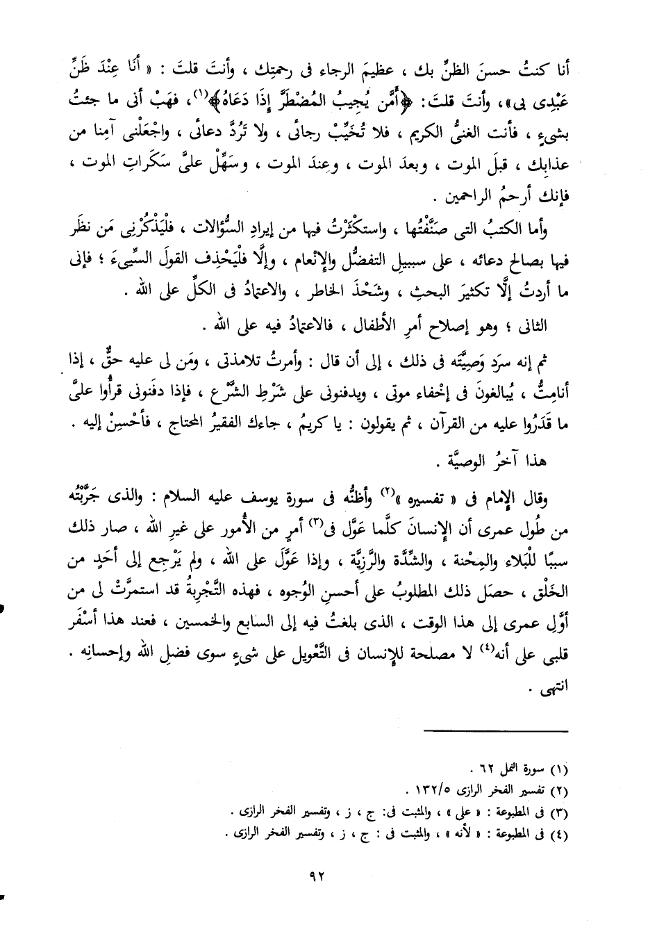 وَقَالَ الإِمَام فِي تَفْسِيره وَأَظنهُ فِي سُورَة يُوسُف عَلَيْهِ السَّلَام وَالَّذِي جربته من طول عمري أَن الْإِنْسَان كلما عول فِي أَمر من الْأُمُور على غير الله صَار ذَلِك سَببا للبلاء والمحنة والشدة والرزية وَإِذا عول على الله وَلم يرجع إِلَى أحد من الْخلق حصل ذَلِك الْمَطْلُوب على أحسن الْوُجُوه فَهَذِهِ التجربة قد استمرت لي من أول عمري إِلَى هَذَا الْوَقْت الَّذِي بلغت فِيهِ إِلَى السَّابِع وَالْخمسين فَعِنْدَ هَذَا أَسْفر قلبِي على أَنه لَا مصلحَة للْإنْسَان فِي التعويل على شَيْء سوى فضل الله وإحسانه انْتهى