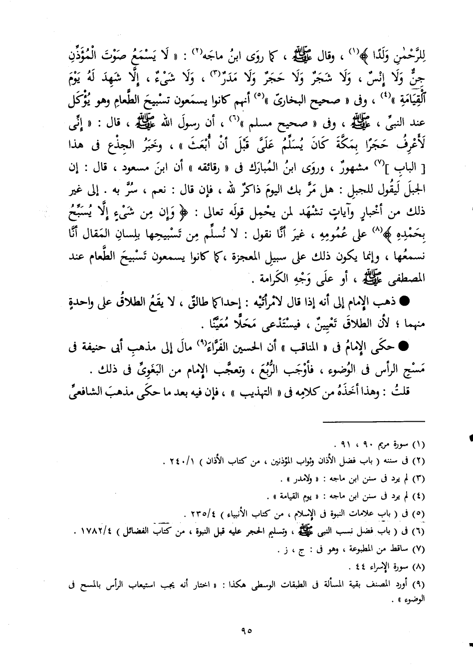 ) وَقَالَ صلى الله عَلَيْهِ وَسلم كَمَا روى ابْن ماجة لَا يسمع صَوت الْمُؤَذّن جن وَلَا إنس وَلَا شجر وَلَا حجر وَلَا مدر وَلَا شَيْء إِلَّا شهد لَهُ يَوْم الْقِيَامَة وَفِي صَحِيح البُخَارِيّ أَنهم كَانُوا يسمعُونَ تَسْبِيح الطَّعَام وَهُوَ يُؤْكَل عِنْد النَّبِي صلى الله عَلَيْهِ وَسلم وَفِي صَحِيح مُسلم أَن رَسُول الله صلى الله عَلَيْهِ وَسلم قَالَ إِنِّي لأعرف حجرا بِمَكَّة كَانَ يسلم عَليّ قبل أَن أبْعث وَخبر الْجذع فِي هَذَا الْبَاب مَشْهُور وروى ابْن الْمُبَارك فِي رقائقه أَن ابْن مَسْعُود قَالَ إِن الْجَبَل ليقول للجبل هَل مر بك الْيَوْم ذَاكر لله فَإِن قَالَ نعم سر بِهِ إِلَى غير ذَلِك من أَخْبَار وآيات تشهد لمن يحمل قَوْله تَعَالَى {وَإِن من شَيْء إِلَّا يسبح بِحَمْدِهِ} على عُمُومه غير أَنا نقُول لَا نسلم من تسبيحها بِلِسَان الْمقَال أَنا نسمعها وَإِنَّمَا يكون ذَلِك على سَبِيل المعجزة كَمَا كَانُوا يسمعُونَ تَسْبِيح الطَّعَام عِنْد الْمُصْطَفى صلى الله عَلَيْهِ وَسلم أَو على وَجه الْكَرَامَة