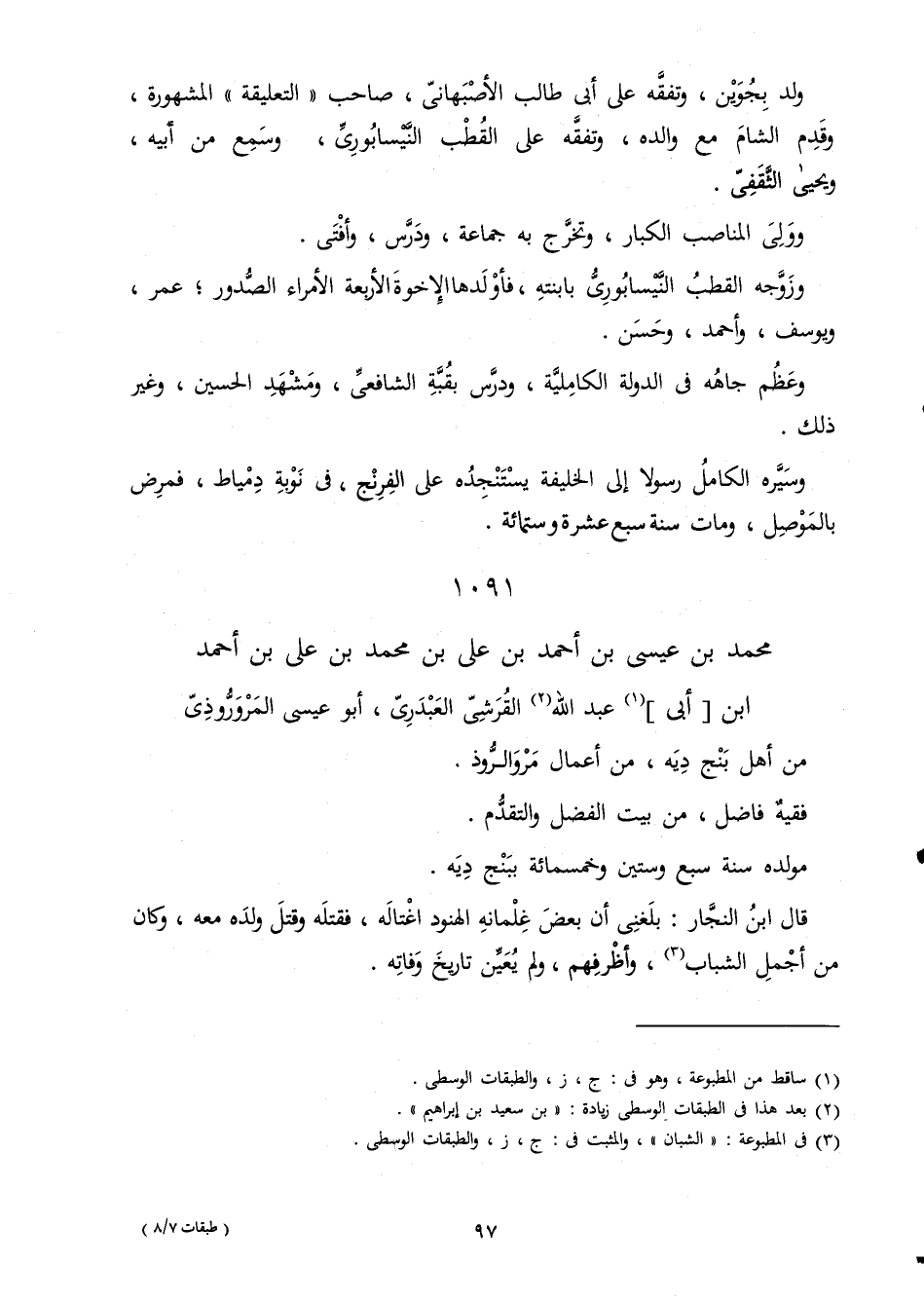 1091 - مُحَمَّد بن عِيسَى بن أَحْمد بن عَليّ بن مُحَمَّد بن عَليّ بن أَحْمد ابْن أبي عبد الله الْقرشِي الْعَبدَرِي أَبُو عِيسَى المروروذي