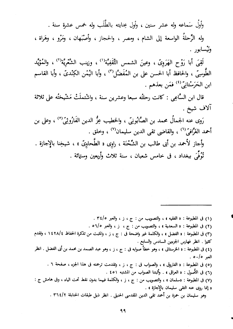 قَالَ ابْن السَّاعِي كَانَت رحلته سبعا وَعشْرين سنة واشتملت مشيخته على ثَلَاثَة آلَاف شيخ
