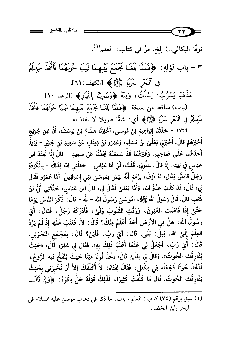 (¬1) سبق برقم (74) كتاب: العلم، باب: ما ذكر في ذهاب موسى - عليه السلام- في البحر إلى الخضر.