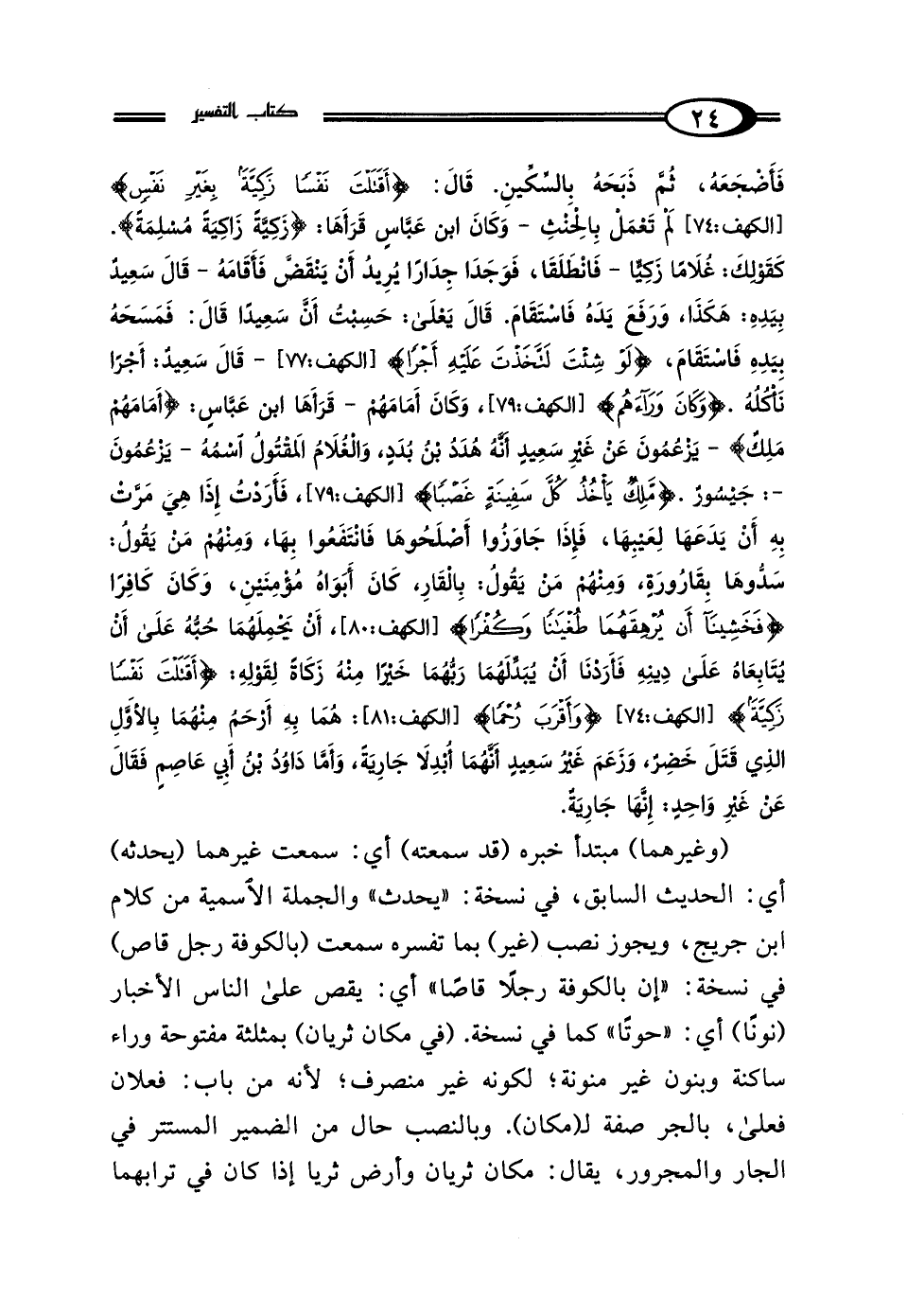 فَأَضْجَعَهُ ثُمَّ ذَبَحَهُ بِالسِّكِّينِ - {قَال: أَقَتَلْتَ نَفْسًا زَكِيَّةً بِغَيْرِ نَفْسٍ} [الكهف: 74] لَمْ تَعْمَلْ بِالحِنْثِ - وَكَانَ ابْنُ عَبَّاسٍ قَرَأَهَا زَكِيَّةً (زَاكِيَةً): مُسْلِمَةً كَقَوْلِكَ غُلامًا زَكِيًّا - فَانْطَلَقَا فَوَجَدَا جِدَارًا يُرِيدُ أَنْ يَنْقَضَّ، فَأَقَامَهُ - قَال سَعِيدٌ بِيَدِهِ هَكَذَا، وَرَفَعَ يَدَهُ فَاسْتَقَامَ، قَال يَعْلَى: حَسِبْتُ أَنَّ سَعِيدًا قَال: فَمَسَحَهُ بِيَدِهِ فَاسْتَقَامَ - {لَوْ شِئْتَ لاتَّخَذْتَ عَلَيْهِ أَجْرًا} [الكهف: 77]- قَال سَعِيدٌ: أَجْرًا نَأْكُلُهُ - {وَكَانَ وَرَاءَهُمْ} [الكهف: 79] وَكَانَ أَمَامَهُمْ - قَرَأَهَا ابْنُ عَبَّاسٍ: أَمَامَهُمْ مَلِكٌ، يَزْعُمُونَ عَنْ غَيْرِ سَعِيدٍ أَنَّهُ هُدَدُ بْنُ بُدَدَ، وَالغُلامُ المَقْتُولُ اسْمُهُ يَزْعُمُونَ جَيْسُورٌ - {مَلِكٌ يَأْخُذُ كُلَّ سَفِينَةٍ غَصْبًا} [الكهف: 79]، فَأَرَدْتُ إِذَا هِيَ مَرَّتْ بِهِ أَنْ يَدَعَهَا لِعَيْبِهَا، فَإِذَا جَاوَزُوا أَصْلَحُوهَا فَانْتَفَعُوا بِهَا - وَمِنْهُمْ مَنْ يَقُولُ: سَدُّوهَا بِقَارُورَةٍ، وَمِنْهُمْ مَنْ يَقُولُ بِالقَارِ - {كَانَ أَبَوَاهُ مُؤْمِنَيْنِ} وَكَانَ كَافِرًا {فَخَشِينَا أَنْ يُرْهِقَهُمَا طُغْيَانًا، وَكُفْرًا} [الكهف: 80] أَنْ يَحْمِلَهُمَا حُبُّهُ عَلَى أَنْ يُتَابِعَاهُ عَلَى دِينِهِ، (فَأَرَدْنَا أَنْ يُبَدِّلَهُمَا رَبُّهُمَا خَيْرًا مِنْهُ زَكَاةً) لِقَوْلِهِ: {أَقَتَلْتَ نَفْسًا زَكِيَّةً} [الكهف: 74] {وَأَقْرَبَ رُحْمًا} [الكهف: 81] هُمَا بِهِ أَرْحَمُ مِنْهُمَا بِالأَوَّلِ، الَّذِي قَتَلَ خَضِرٌ -وَزَعَمَ غَيْرُ سَعِيدٍ: أَنَّهُمَا أُبْدِلا جَارِيَةً، وَأَمَّا دَاوُدُ بْنُ أَبِي عَاصِمٍ فَقَال: عَنْ غَيْرِ وَاحِدٍ: إِنَّهَا جَارِيَةٌ-.