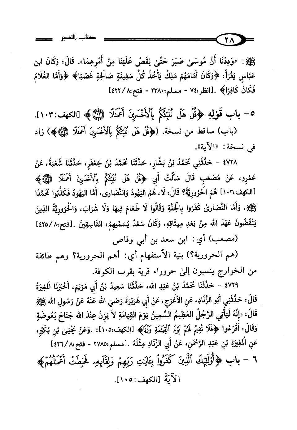 4728 - حَدَّثَنِي مُحَمَّدُ بْنُ بَشَّارٍ، حَدَّثَنَا مُحَمَّدُ بْنُ جَعْفَرٍ، حَدَّثَنَا شُعْبَةُ، عَنْ عَمْرِو بْنِ مُرَّةَ، عَنْ مُصْعَبِ بْنِ سَعْدٍ، قَال: سَأَلْتُ أَبِي: {قُلْ هَلْ نُنَبِّئُكُمْ بِالأَخْسَرِينَ أَعْمَالًا} [الكهف: 103]: هُمُ الحَرُورِيَّةُ؟ قَال: "لَا هُمُ اليَهُودُ وَالنَّصَارَى، أَمَّا اليَهُودُ فَكَذَّبُوا مُحَمَّدًا صَلَّى اللهُ عَلَيْهِ وَسَلَّمَ، وَأَمَّا النَّصَارَى فَكَفَرُوا بِالْجَنَّةِ وَقَالُوا: لَا طَعَامَ فِيهَا وَلَا شَرَابَ، وَالحَرُورِيَّةُ الَّذِينَ يَنْقُضُونَ عَهْدَ اللَّهِ مِنْ بَعْدِ مِيثَاقِهِ"، وَكَانَ سَعْدٌ يُسَمِّيهِمُ الفَاسِقِينَ.