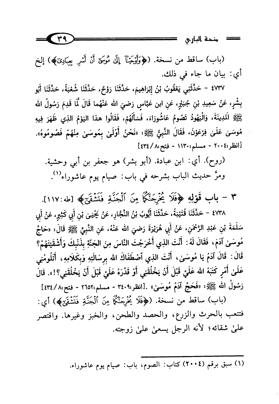 4737 - حَدَّثَنِي يَعْقُوبُ بْنُ إِبْرَاهِيمَ، حَدَّثَنَا رَوْحٌ، حَدَّثَنَا شُعْبَةُ، حَدَّثَنَا أَبُو بِشْرٍ، عَنْ سَعِيدِ بْنِ جُبَيْرٍ، عَنِ ابْنِ عَبَّاسٍ رَضِيَ اللَّهُ عَنْهُمَا، قَال: لَمَّا قَدِمَ رَسُولُ اللَّهِ صَلَّى اللهُ عَلَيْهِ وَسَلَّمَ المَدِينَةَ وَاليَهُودُ تَصُومُ يَوْمَ عَاشُورَاءَ، فَسَأَلَهُمْ، فَقَالُوا: هَذَا اليَوْمُ الَّذِي ظَهَرَ فِيهِ مُوسَى عَلَى فِرْعَوْنَ، فَقَال النَّبِيُّ صَلَّى اللهُ عَلَيْهِ وَسَلَّمَ: "نَحْنُ أَوْلَى بِمُوسَى مِنْهُمْ فَصُومُوهُ".