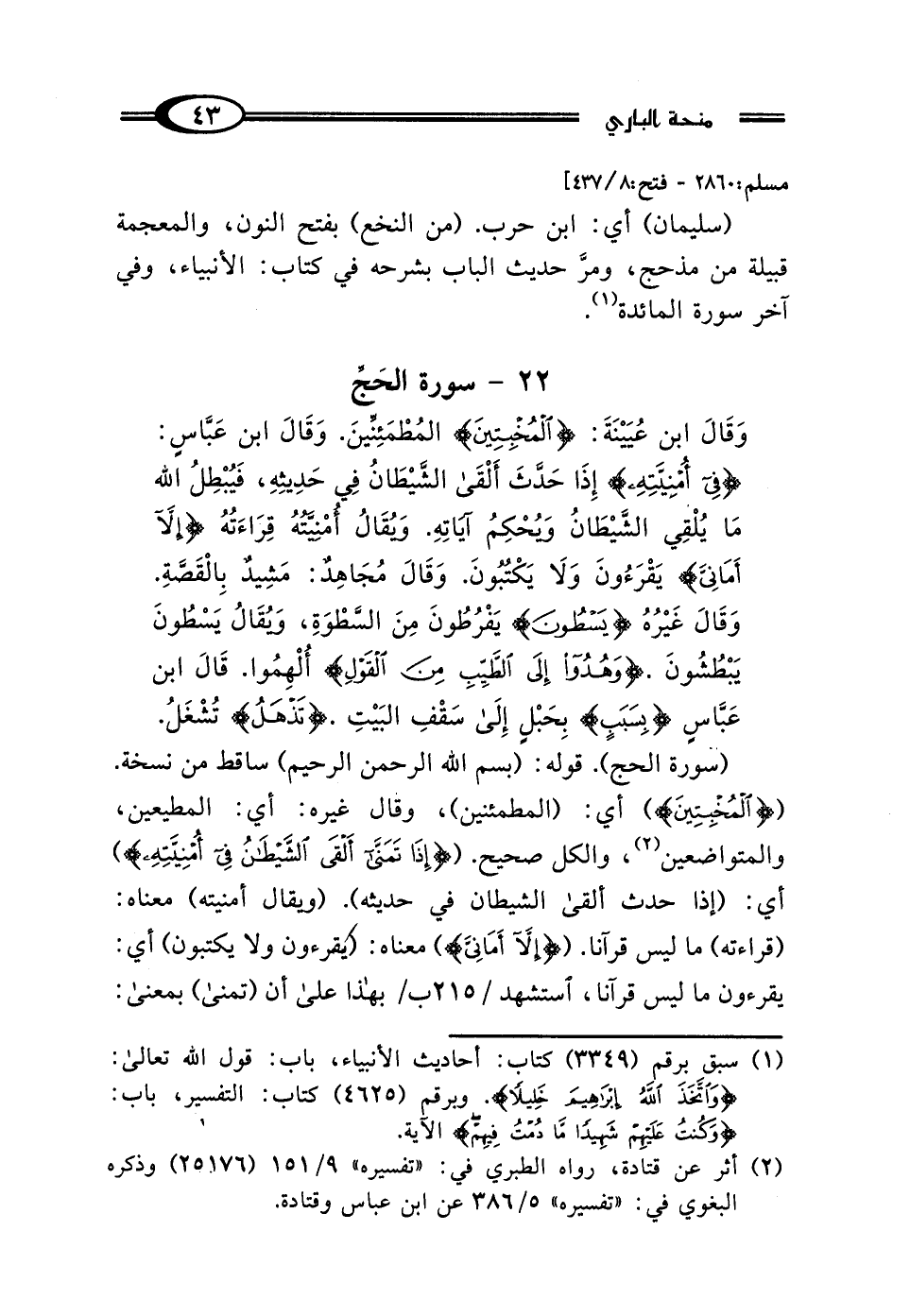 وَقَال ابْنُ عُيَيْنَةَ: {المُخْبِتِينَ} [الحج: 34]: "المُطْمَئِنِّينَ" وَقَال ابْنُ عَبَّاسٍ: "فِي إِذَا تَمَنَّى أَلْقَى الشَّيْطَانُ فِي أُمْنِيَّتِهِ، إِذَا حَدَّثَ أَلْقَى الشَّيْطَانُ فِي حَدِيثِهِ، فَيُبْطِلُ اللَّهُ مَا يُلْقِي الشَّيْطَانُ وَيُحْكِمُ آيَاتِهِ، وَيُقَالُ: أُمْنِيَّتُهُ قِرَاءَتُهُ"، {إلا أَمَانِيَّ} [البقرة: 78]: "يَقْرَءُونَ وَلَا يَكْتُبُونَ" وَقَال مُجَاهِدٌ: {مَشِيدٌ} [الحج: 45]: "بِالقَصَّةِ جِصٌّ" وَقَال غَيْرُهُ: {يَسْطُونَ} [الحج: 72]: "يَفْرُطُونَ، مِنَ السَّطْوَةِ"، وَيُقَالُ: {يَسْطُونَ} [الحج: 72]: "يَبْطِشُونَ"، {وَهُدُوا إِلَى الطَّيِّبِ} [الحج: 24]: "أُلْهِمُوا" وَقَال ابْنُ أَبِي خَالِدٍ: إِلَى القُرْآنِ {وَهُدُوا إِلَى صِرَاطِ الحَمِيدِ} [الحج: 24]: "الإِسْلامِ" وَقَال ابْنُ عَبَّاسٍ: {بِسَبَبٍ} [الحج: 15]: "بِحَبْلٍ إِلَى سَقْفِ البَيْتِ"، {ثَانِيَ عِطْفِهِ} [الحج: 9]: "مُسْتَكْبِرٌ"، {تَذْهَلُ} [الحج: 2]: "تُشْغَلُ".