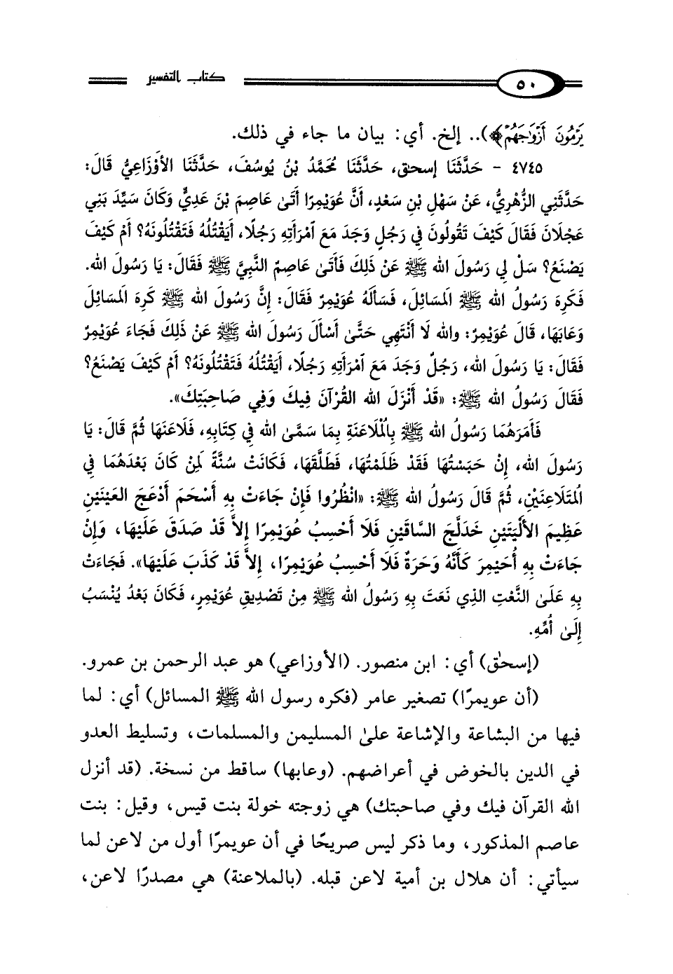 4745 - حَدَّثَنَا إِسْحَاقُ، حَدَّثَنَا مُحَمَّدُ بْنُ يُوسُفَ، حَدَّثَنَا الأَوْزَاعِيُّ، قَال: حَدَّثَنِي الزُّهْرِيُّ، عَنْ سَهْلِ بْنِ سَعْدٍ، أَنَّ عُوَيْمِرًا، أَتَى عَاصِمَ بْنَ عَدِيٍّ وَكَانَ سَيِّدَ بَنِي عَجْلانَ، فَقَال: كَيْفَ تَقُولُونَ فِي رَجُلٍ وَجَدَ مَعَ امْرَأَتِهِ رَجُلًا، أَيَقْتُلُهُ فَتَقْتُلُونَهُ، أَمْ كَيْفَ يَصْنَعُ؟ سَلْ لِي رَسُولَ اللَّهِ صَلَّى اللهُ عَلَيْهِ وَسَلَّمَ عَنْ ذَلِكَ، فَأَتَى عَاصِمٌ النَّبِيَّ صَلَّى اللهُ عَلَيْهِ وَسَلَّمَ، فَقَال: يَا رَسُولَ اللَّهِ فَكَرِهَ رَسُولُ اللَّهِ صَلَّى اللهُ عَلَيْهِ وَسَلَّمَ المَسَائِلَ، فَسَأَلَهُ عُوَيْمِرٌ، فَقَال: إِنَّ رَسُولَ اللَّهِ صَلَّى اللهُ عَلَيْهِ وَسَلَّمَ كَرِهَ المَسَائِلَ وَعَابَهَا، قَال عُوَيْمِرٌ: وَاللَّهِ لَا أَنْتَهِي حَتَّى أَسْأَلَ رَسُولَ اللَّهِ صَلَّى اللهُ عَلَيْهِ وَسَلَّمَ عَنْ ذَلِكَ، فَجَاءَ عُوَيْمِرٌ، فَقَال: يَا رَسُولَ اللَّهِ رَجُلٌ وَجَدَ مَعَ امْرَأَتِهِ رَجُلًا أَيَقْتُلُهُ فَتَقْتُلُونَهُ أَمْ كَيْفَ يَصْنَعُ؟ فَقَال رَسُولُ اللَّهِ صَلَّى اللهُ عَلَيْهِ وَسَلَّمَ: "قَدْ أَنْزَلَ اللَّهُ القُرْآنَ فِيكَ وَفِي صَاحِبَتِكَ"، فَأَمَرَهُمَا رَسُولُ اللَّهِ صَلَّى اللهُ عَلَيْهِ وَسَلَّمَ بِالْمُلاعَنَةِ بِمَا سَمَّى اللَّهُ فِي كِتَابِهِ فَلاعَنَهَا، ثُمَّ قَال: يَا رَسُولَ اللَّهِ، إِنْ حَبَسْتُهَا فَقَدْ ظَلَمْتُهَا فَطَلَّقَهَا، فَكَانَتْ سُنَّةً لِمَنْ كَانَ بَعْدَهُمَا فِي المُتَلاعِنَيْنِ، ثُمَّ قَال رَسُولُ اللَّهِ صَلَّى اللهُ عَلَيْهِ وَسَلَّمَ: "انْظُرُوا فَإِنْ جَاءَتْ بِهِ أَسْحَمَ، أَدْعَجَ العَيْنَيْنِ، عَظِيمَ الأَلْيَتَيْنِ، خَدَلَّجَ السَّاقَيْنِ، فَلَا أَحْسِبُ عُوَيْمِرًا إلا قَدْ صَدَقَ عَلَيْهَا، وَإِنْ جَاءَتْ بِهِ أُحَيْمِرَ كَأَنَّهُ وَحَرَةٌ، فَلَا أَحْسِبُ عُوَيْمِرًا إلا قَدْ كَذَبَ عَلَيْهَا"، فَجَاءَتْ بِهِ عَلَى النَّعْتِ الَّذِي نَعَتَ بِهِ رَسُولُ اللَّهِ صَلَّى اللهُ عَلَيْهِ وَسَلَّمَ مِنْ تَصْدِيقِ عُوَيْمِرٍ، فَكَانَ بَعْدُ يُنْسَبُ إِلَى أُمِّهِ.