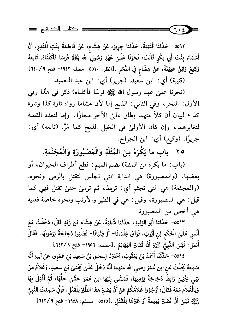 5512 - حَدَّثَنَا قُتَيْبَةُ، حَدَّثَنَا جَرِيرٌ، عَنْ هِشَامٍ، عَنْ فَاطِمَةَ بِنْتِ المُنْذِرِ، أَنَّ أَسْمَاءَ بِنْتَ أَبِي بَكْرٍ، قَالتْ: "نَحَرْنَا عَلَى عَهْدِ رَسُولِ اللَّهِ صَلَّى اللهُ عَلَيْهِ وَسَلَّمَ فَرَسًا فَأَكَلْنَاهُ" تَابَعَهُ وَكِيعٌ، وَابْنُ عُيَيْنَةَ، عَنْ هِشَامٍ: فِي النَّحْرِ.