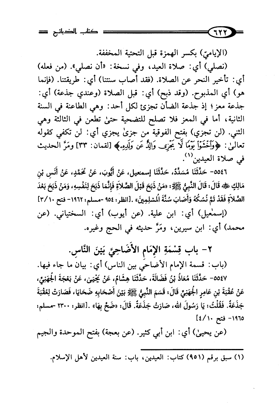 (نصلي) أي: صلاة العيد، وفي نسخة: "أن نصلي". (من فعله) أي: تأخير النحر عن الصلاة. (فقد أصاب سنتنا) أي: طريقتنا. (فإنما هو) أي المذبوح. (وقد ذبح) أي: قبل الصلاة (وعندي جذعة) أي: جذعة معز؛ إذ جذعة الضأن تجزئ لكل أحد: وهي الطاعنة في السنة الثانية، أما في المعز فلا تصلح للتضحية حتى تطعن في الثالثة وهي الثني. (لن تجزي) بفتح الفوقية من جزى يجزي أي: لن تكفي كقوله تعالى: {وَاخْشَوْا يَوْمًا لَا يَجْزِي وَالِدٌ عَنْ وَلَدِهِ} [لقمان: 33] ومرَّ الحديث في صلاة العيدين (¬1).