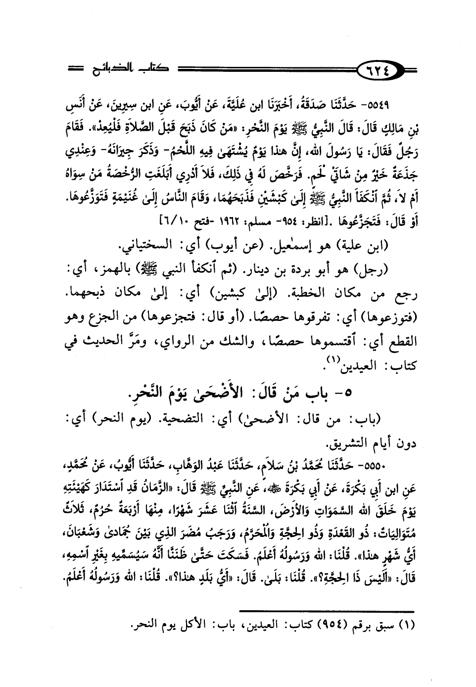 5549 - حَدَّثَنَا صَدَقَةُ، أَخْبَرَنَا ابْنُ عُلَيَّةَ، عَنْ أَيُّوبَ، عَنِ ابْنِ سِيرِينَ، عَنْ أَنَسِ بْنِ مَالِكٍ، قَال: قَال النَّبِيُّ صَلَّى اللهُ عَلَيْهِ وَسَلَّمَ يَوْمَ النَّحْرِ: "مَنْ كَانَ ذَبَحَ قَبْلَ الصَّلاةِ فَلْيُعِدْ" فَقَامَ رَجُلٌ فَقَال: يَا رَسُولَ اللَّهِ، إِنَّ هَذَا يَوْمٌ يُشْتَهَى فِيهِ اللَّحْمُ - وَذَكَرَ جِيرَانَهُ - وَعِنْدِي جَذَعَةٌ خَيْرٌ مِنْ شَاتَيْ لَحْمٍ؟ فَرَخَّصَ لَهُ فِي ذَلِكَ، فَلَا أَدْرِي بَلَغَتِ الرُّخْصَةُ مَنْ سِوَاهُ أَمْ لَا، ثُمَّ انْكَفَأَ النَّبِيُّ صَلَّى اللهُ عَلَيْهِ وَسَلَّمَ إِلَى كَبْشَيْنِ فَذَبَحَهُمَا، وَقَامَ النَّاسُ إِلَى غُنَيْمَةٍ فَتَوَزَّعُوهَا، أَوْ قَال: فَتَجَزَّعُوهَا.
