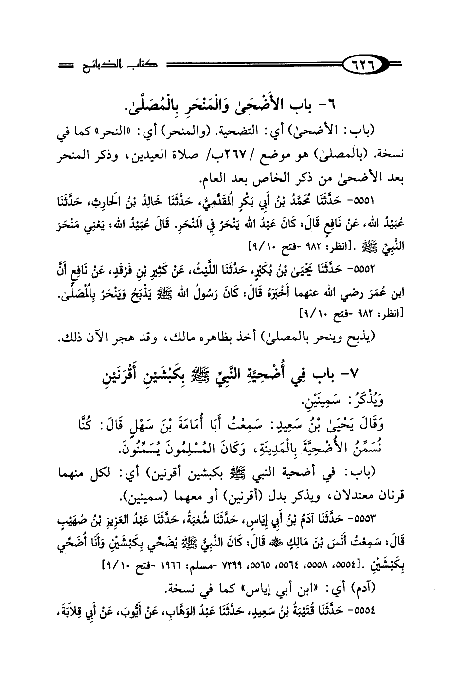 5552 - حَدَّثَنَا يَحْيَى بْنُ بُكَيْرٍ، حَدَّثَنَا اللَّيْثُ، عَنْ كَثِيرِ بْنِ فَرْقَدٍ، عَنْ نَافِعٍ، أَنَّ ابْنَ عُمَرَ، رَضِيَ اللَّهُ عَنْهُمَا أَخْبَرَهُ، قَال: "كَانَ رَسُولُ اللَّهِ صَلَّى اللهُ عَلَيْهِ وَسَلَّمَ يَذْبَحُ وَيَنْحَرُ بِالْمُصَلَّى".
