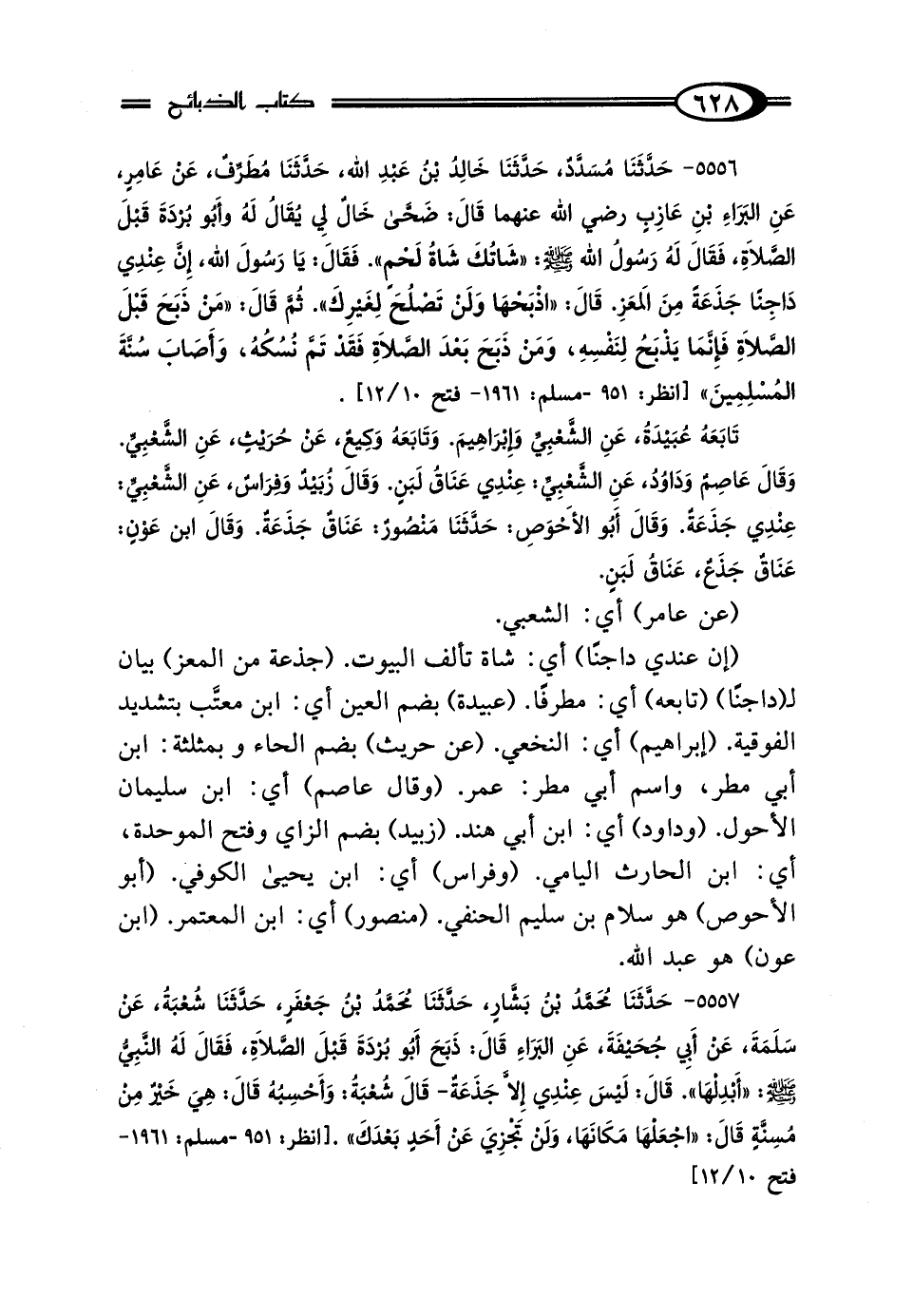 5556 - حَدَّثَنَا مُسَدَّدٌ، حَدَّثَنَا خَالِدُ بْنُ عَبْدِ اللَّهِ، حَدَّثَنَا مُطَرِّفٌ، عَنْ عَامِرٍ، عَنِ البَرَاءِ بْنِ عَازِبٍ رَضِيَ اللَّهُ عَنْهُمَا، قَال: ضَحَّى خَالٌ لِي، يُقَالُ لَهُ أَبُو بُرْدَةَ، قَبْلَ الصَّلاةِ، فَقَال لَهُ رَسُولُ اللَّهِ صَلَّى اللهُ عَلَيْهِ وَسَلَّمَ: "شَاتُكَ شَاةُ لَحْمٍ" فَقَال: يَا رَسُولَ اللَّهِ، إِنَّ عِنْدِي دَاجِنًا جَذَعَةً مِنَ المَعَزِ، قَال: "اذْبَحْهَا، وَلَنْ تَصْلُحَ لِغَيْرِكَ" ثُمَّ قَال: "مَنْ ذَبَحَ قَبْلَ الصَّلاةِ فَإِنَّمَا يَذْبَحُ لِنَفْسِهِ، وَمَنْ ذَبَحَ بَعْدَ الصَّلاةِ فَقَدْ تَمَّ نُسُكُهُ وَأَصَابَ سُنَّةَ المُسْلِمِينَ".