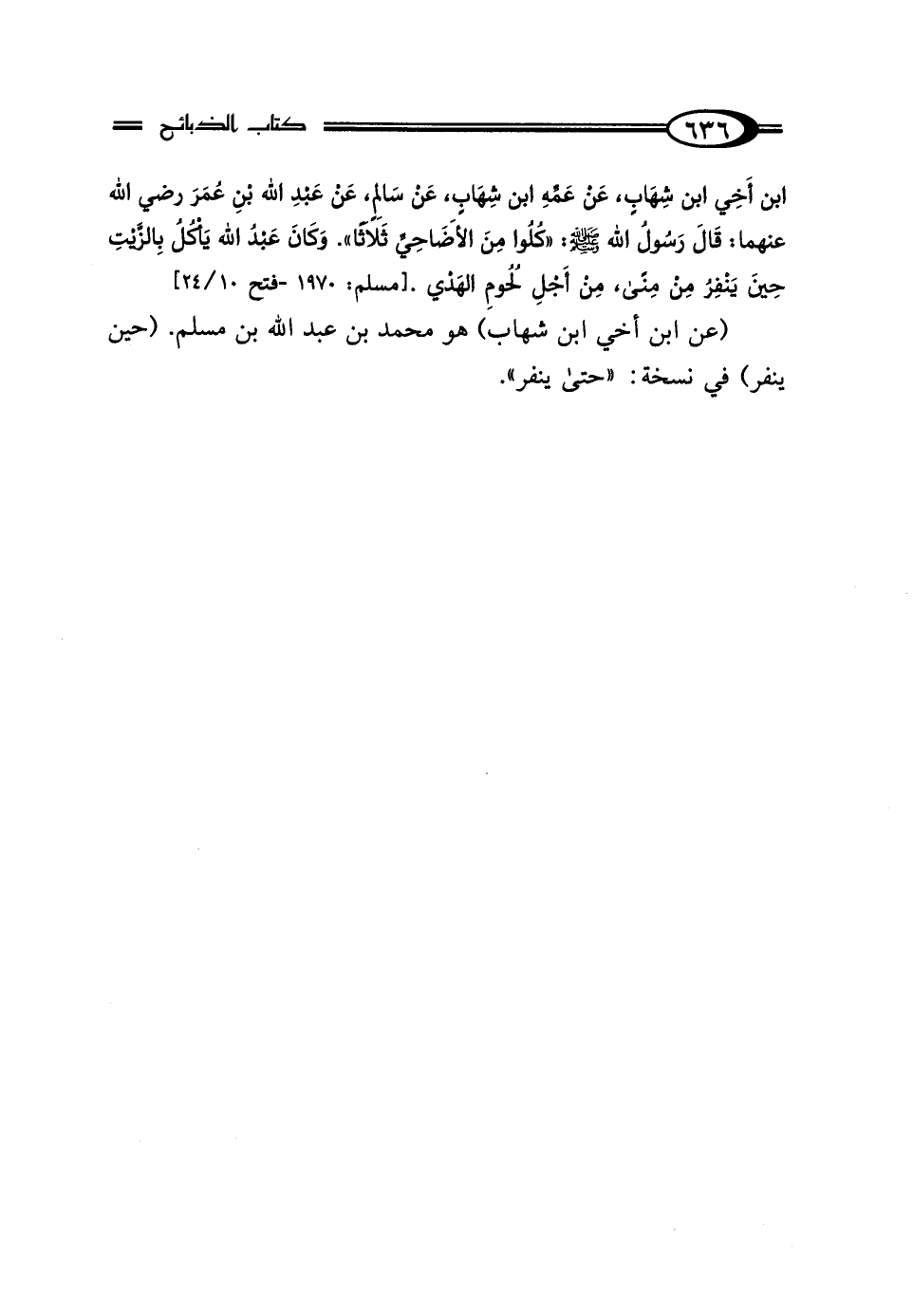 ابْنِ أَخِي ابْنِ شِهَابٍ، عَنْ عَمِّهِ ابْنِ شِهَابٍ، عَنْ سَالِمٍ، عَنْ عَبْدِ اللَّهِ بْنِ عُمَرَ رَضِيَ اللَّهُ عَنْهُمَا، قَال رَسُولُ اللَّهِ صَلَّى اللهُ عَلَيْهِ وَسَلَّمَ: "كُلُوا مِنَ الأَضَاحِيِّ ثَلاثًا" وَكَانَ عَبْدُ اللَّهِ يَأْكُلُ بِالزَّيْتِ حِينَ يَنْفِرُ مِنْ مِنًى، مِنْ أَجْلِ لُحُومِ الهَدْيِ.