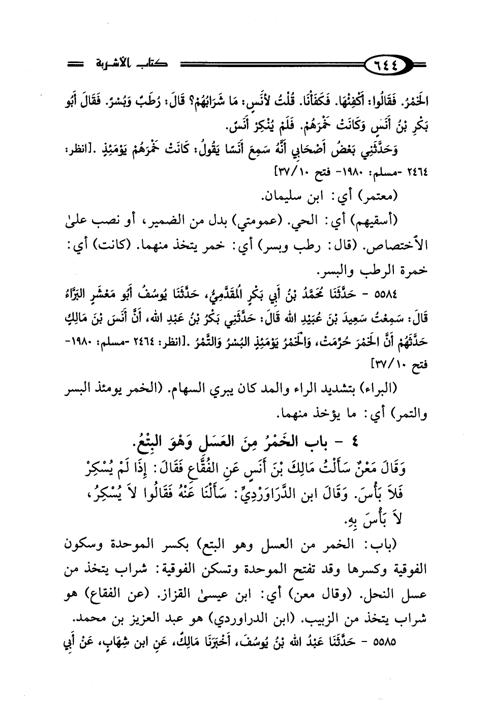 الخَمْرُ، فَقَالُوا: أَكْفِئْهَا، فَكَفَأْتُهَا " قُلْتُ لِأَنَسٍ: مَا شَرَابُهُمْ؟ قَال: "رُطَبٌ وَبُسْرٌ" فَقَال أَبُو بَكْرِ بْنُ أَنَسٍ: وَكَانَتْ خَمْرَهُمْ، فَلَمْ يُنْكِرْ أَنَسٌ وَحَدَّثَنِي بَعْضُ أَصْحَابِي: أَنَّهُ سَمِعَ أَنَسَ بْنَ مَالِكٍ يَقُولُ: "كَانَتْ خَمْرَهُمْ يَوْمَئِذٍ".