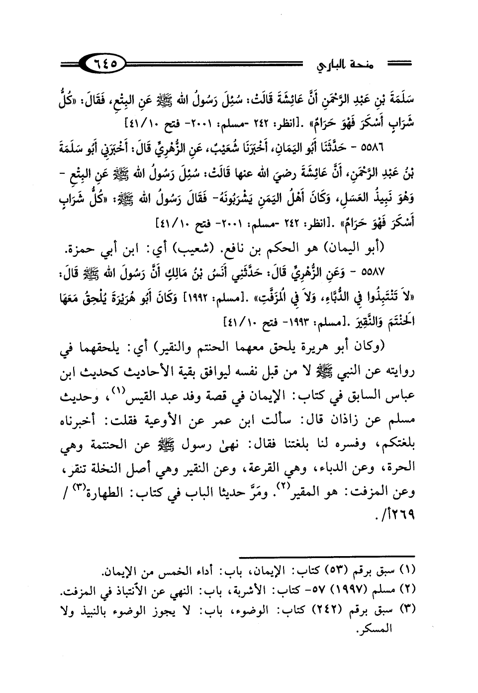 5587 - وَعَنِ الزُّهْرِيِّ، قَال: حَدَّثَنِي أَنَسُ بْنُ مَالِكٍ: أَنَّ رَسُولَ اللَّهِ صَلَّى اللهُ عَلَيْهِ وَسَلَّمَ قَال: "لَا تَنْتَبِذُوا فِي الدُّبَّاءِ، وَلَا فِي المُزَفَّتِ" وَكَانَ أَبُو هُرَيْرَةَ، يُلْحِقُ مَعَهَا: "الحَنْتَمَ وَالنَّقِيرَ".