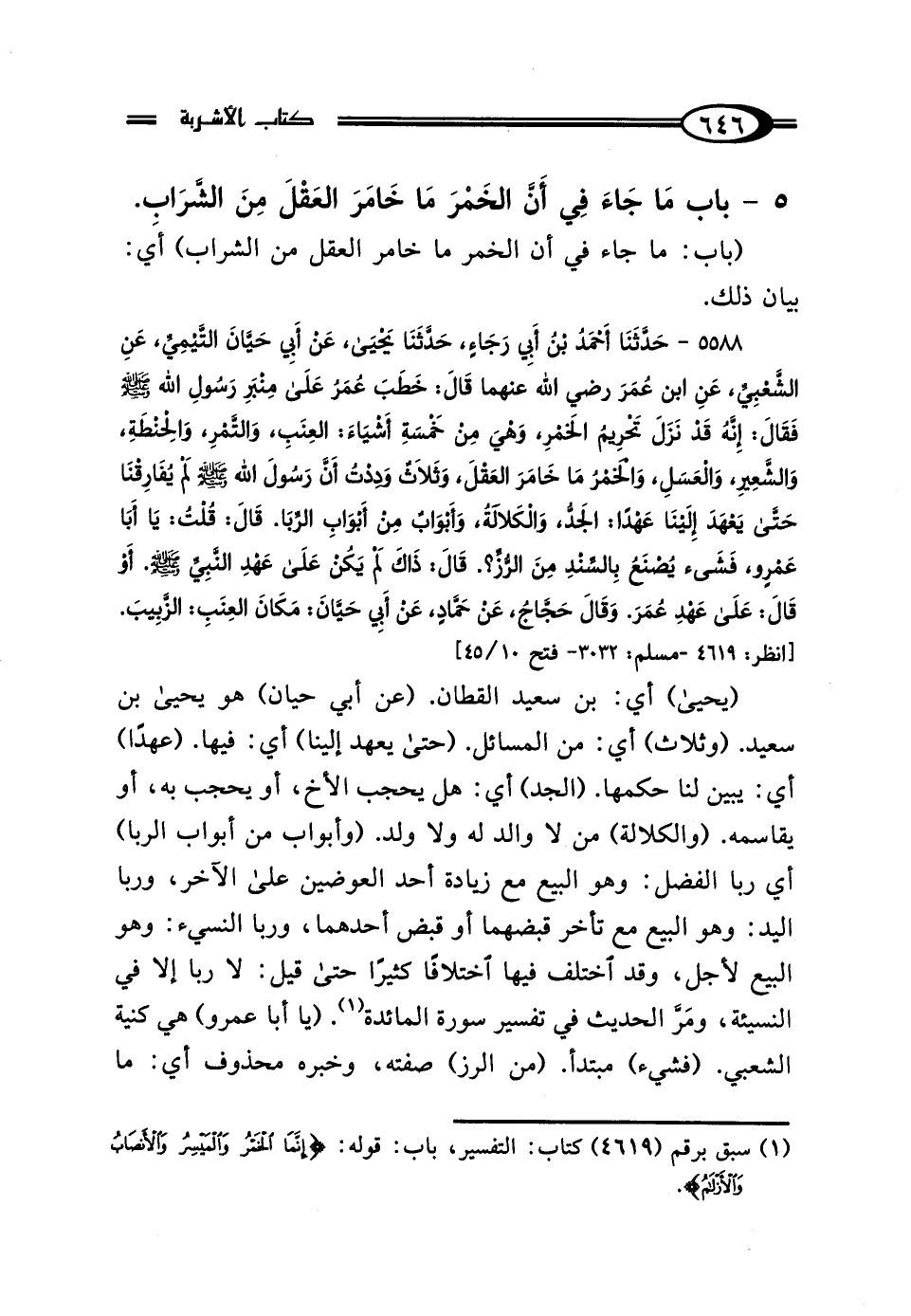 5588 - حَدَّثَنَا أَحْمَدُ ابْنُ أَبِي رَجَاءٍ، حَدَّثَنَا يَحْيَى، عَنْ أَبِي حَيَّانَ التَّيْمِيِّ، عَنِ الشَّعْبِيِّ، عَنِ ابْنِ عُمَرَ رَضِيَ اللَّهُ عَنْهُمَا، قَال: خَطَبَ عُمَرُ، عَلَى مِنْبَرِ رَسُولِ اللَّهِ صَلَّى اللهُ عَلَيْهِ وَسَلَّمَ فَقَال: "إِنَّهُ قَدْ نَزَلَ تَحْرِيمُ الخَمْرِ وَهِيَ مِنْ خَمْسَةِ أَشْيَاءَ: العِنَبِ وَالتَّمْرِ وَالحِنْطَةِ وَالشَّعِيرِ وَالعَسَلِ، وَالخَمْرُ مَا خَامَرَ العَقْلَ. وَثَلاثٌ، وَدِدْتُ أَنَّ رَسُولَ اللَّهِ صَلَّى اللهُ عَلَيْهِ وَسَلَّمَ لَمْ يُفَارِقْنَا حَتَّى يَعْهَدَ إِلَيْنَا عَهْدًا: الجَدُّ، وَالكَلالةُ، وَأَبْوَابٌ مِنْ أَبْوَابِ الرِّبَا " قَال: قُلْتُ يَا أَبَا عَمْرٍو، فَشَيْءٌ يُصْنَعُ بِالسِّنْدِ مِنَ الأُرْزِ؟ قَال: "ذَاكَ لَمْ يَكُنْ عَلَى عَهْدِ النَّبِيِّ صَلَّى اللهُ عَلَيْهِ وَسَلَّمَ - أَوْ قَال: - عَلَى عَهْدِ عُمَرَ " وَقَال حَجَّاجٌ: عَنْ حَمَّادٍ، عَنْ أَبِي حَيَّانَ: "مَكَانَ العِنَبِ الزَّبِيبَ".