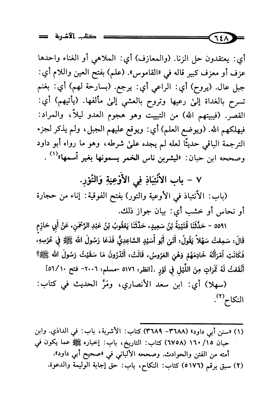 أي: يعتقدون حل الزنا. (والمعازف) أي: الملاهي أو الغناء واحدها عزف أو معزف كبير قاله في "القاموس". (علم) بفتح العين واللام أي: جبل عال. (يروح) أي: الراعي أي: يرجع. (بسارحة لهم) أي: بغنم تسرح بالغداة إلى رعيها وتروح بالعشي إلى مألفها. (يأتيهم) أي: القصر. (فيبيتهم الله) من التبييت وهو هجوم العدو ليلًا، والمراد: فيهلكهم الله. (ويوضع العلم) أي: ويوقع عليهم الجبل، ولم يذكر لجزء الترجمة الباقي حديثًا لعله لم يجده على شرطه، وهو ما رواه أبو داود وصححه ابن حبان: "ليشربن ناس الخمر يسمونها بغير اسمها" (¬1).