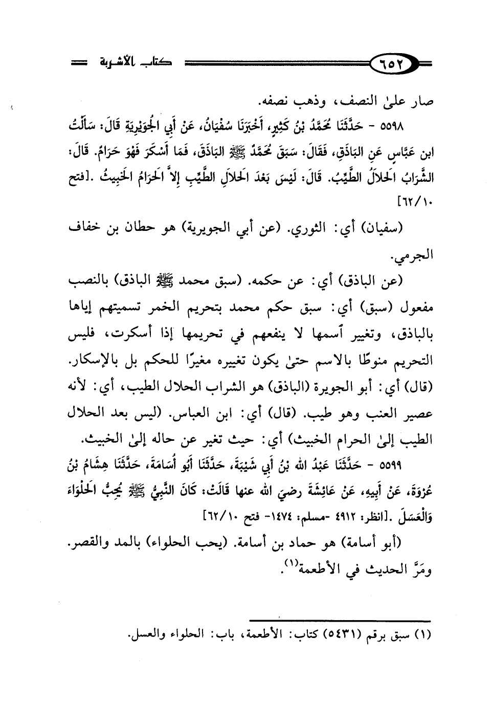 5598 - حَدَّثَنَا مُحَمَّدُ بْنُ كَثِيرٍ، أَخْبَرَنَا سُفْيَانُ، عَنْ أَبِي الجُوَيْرِيَةِ، قَال: سَأَلْتُ ابْنَ عَبَّاسٍ، عَنِ البَاذَقِ فَقَال: سَبَقَ مُحَمَّدٌ صَلَّى اللهُ عَلَيْهِ وَسَلَّمَ البَاذَقَ: "فَمَا أَسْكَرَ فَهُوَ حَرَامٌ" قَال: الشَّرَابُ الحَلالُ الطَّيِّبُ، قَال: "لَيْسَ بَعْدَ الحَلالِ الطَّيِّبِ إلا الحَرَامُ الخَبِيثُ".
