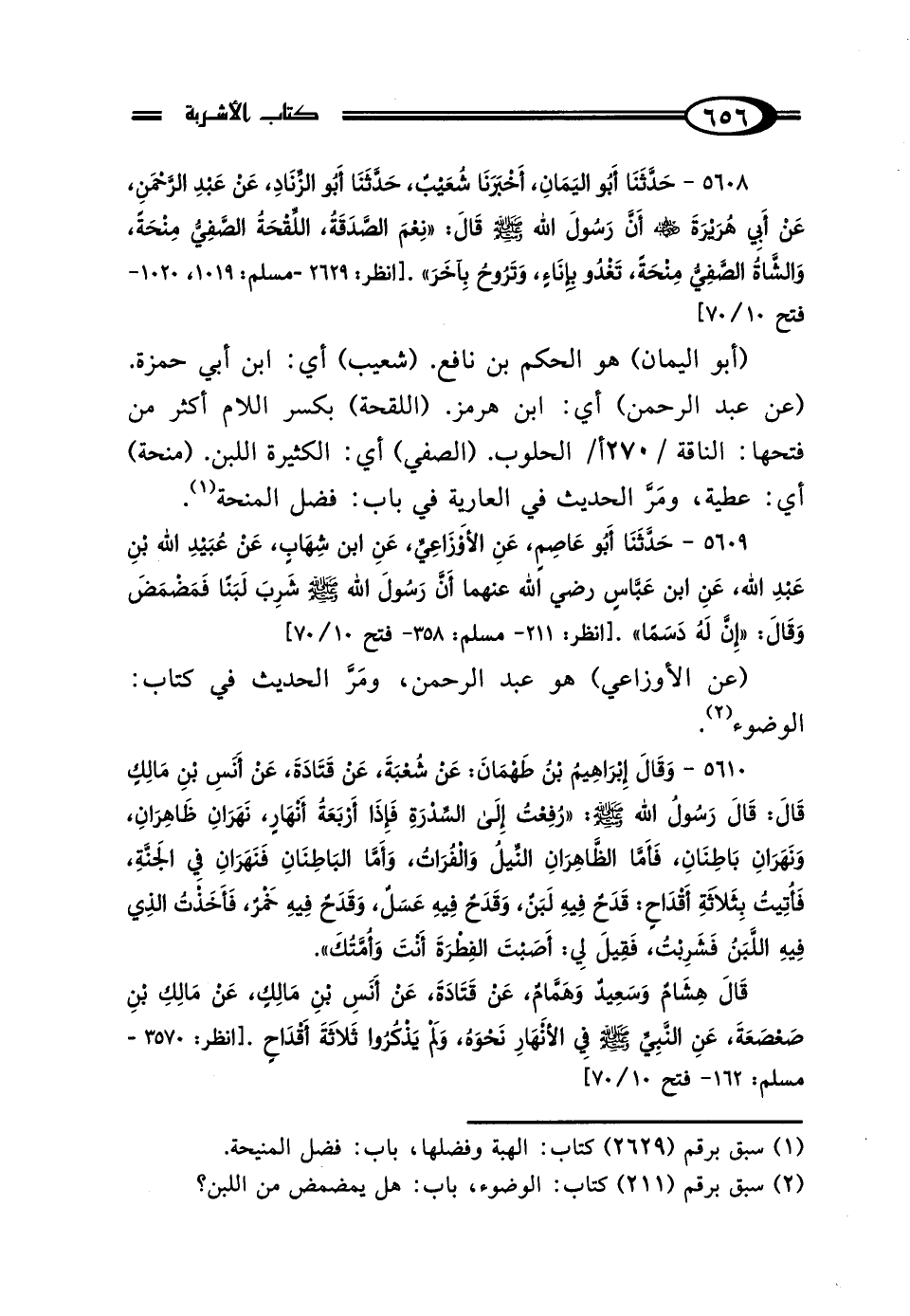 5608 - حَدَّثَنَا أَبُو اليَمَانِ، أَخْبَرَنَا شُعَيْبٌ، حَدَّثَنَا أَبُو الزِّنَادِ، عَنْ عَبْدِ الرَّحْمَنِ، عَنْ أَبِي هُرَيْرَةَ رَضِيَ اللَّهُ عَنْهُ: أَنَّ رَسُولَ اللَّهِ صَلَّى اللهُ عَلَيْهِ وَسَلَّمَ قَال: "نِعْمَ الصَّدَقَةُ اللِّقْحَةُ الصَّفِيُّ مِنْحَةً، وَالشَّاةُ الصَّفِيُّ مِنْحَةً، تَغْدُو بِإِنَاءٍ، وَتَرُوحُ بِآخَرَ".