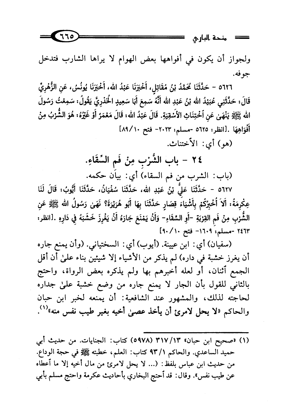5627 - حَدَّثَنَا عَلِيُّ بْنُ عَبْدِ اللَّهِ، حَدَّثَنَا سُفْيَانُ، حَدَّثَنَا أَيُّوبُ، قَال لَنَا عِكْرِمَةُ: أَلا أُخْبِرُكُمْ بِأَشْيَاءَ قِصَارٍ حَدَّثَنَا بِهَا أَبُو هُرَيْرَةَ؟ "نَهَى رَسُولُ اللَّهِ صَلَّى اللهُ عَلَيْهِ وَسَلَّمَ عَنِ الشُّرْبِ مِنْ فَمِ القِرْبَةِ أَو السِّقَاءِ، وَأَنْ يَمْنَعَ جَارَهُ أَنْ يَغْرِزَ خَشَبَهُ فِي دَارِهِ".