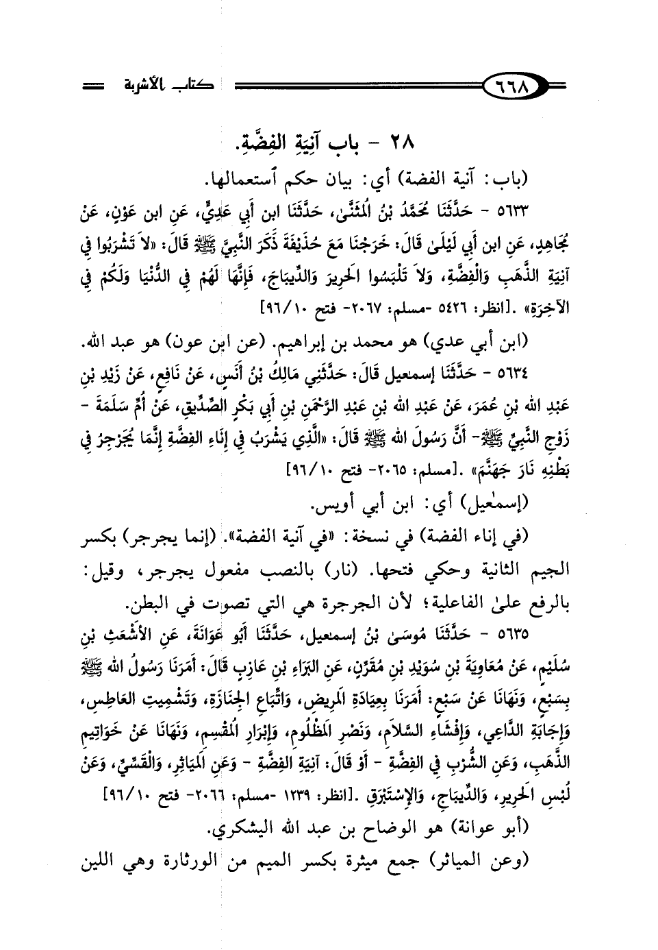 5633 - حَدَّثَنَا مُحَمَّدُ بْنُ المُثَنَّى، حَدَّثَنَا ابْنُ أَبِي عَدِيٍّ، عَنِ ابْنِ عَوْنٍ، عَنْ مُجَاهِدٍ، عَنِ ابْنِ أَبِي لَيْلَى، قَال: خَرَجْنَا مَعَ حُذَيْفَةَ، وَذَكَرَ النَّبِيَّ صَلَّى اللهُ عَلَيْهِ وَسَلَّمَ قَال: "لَا تَشْرَبُوا فِي آنِيَةِ الذَّهَبِ وَالفِضَّةِ، وَلَا تَلْبَسُوا الحَرِيرَ وَالدِّيبَاجَ، فَإِنَّهَا لَهُمْ فِي الدُّنْيَا وَلَكُمْ فِي الآخِرَةِ".