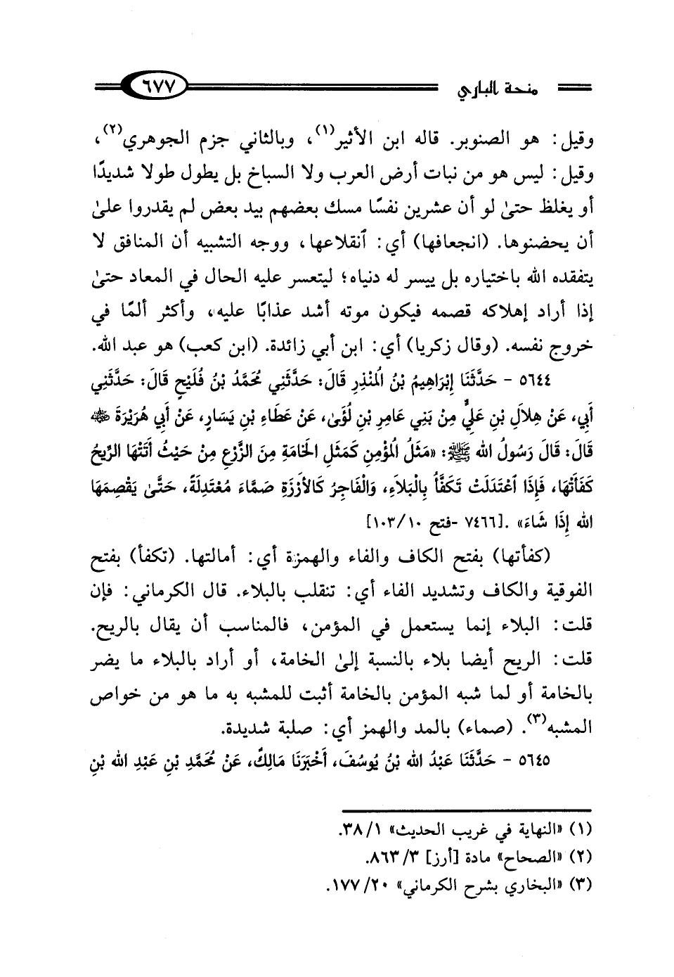 (كفأتها) بفتح الكاف والفاء والهمزة أي: أمالتها. (تكفأ) بفتح الفوقية والكاف وتشديد الفاء أي: تنقلب بالبلاء. قال الكرماني: فإن قلت: البلاء إنما يستعمل في المؤمن، فالمناسب أن يقال بالريح. قلت: الريح أيضًا بلاء بالنسبة إلى الخامسة، أو أراد بالبلاء ما يضر بالخامة أو لما شبه المؤمن بالخامة أثبت للمشبه به ما هو من خواص المشبه (¬3). (صماء) بالمد والهمز أي: صلبة شديدة.